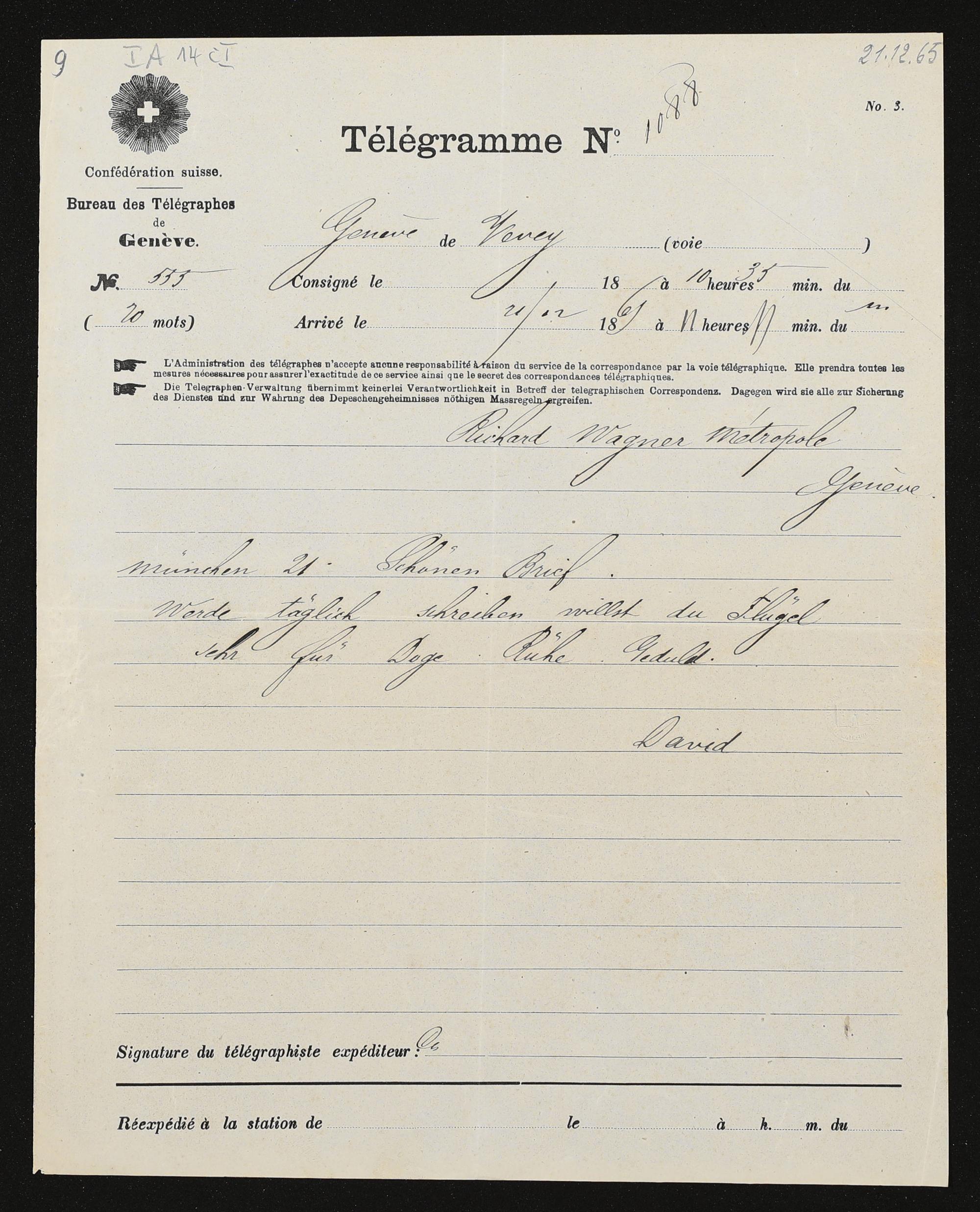 Telegramm von einem unbekannten Absender an Richard Wagner