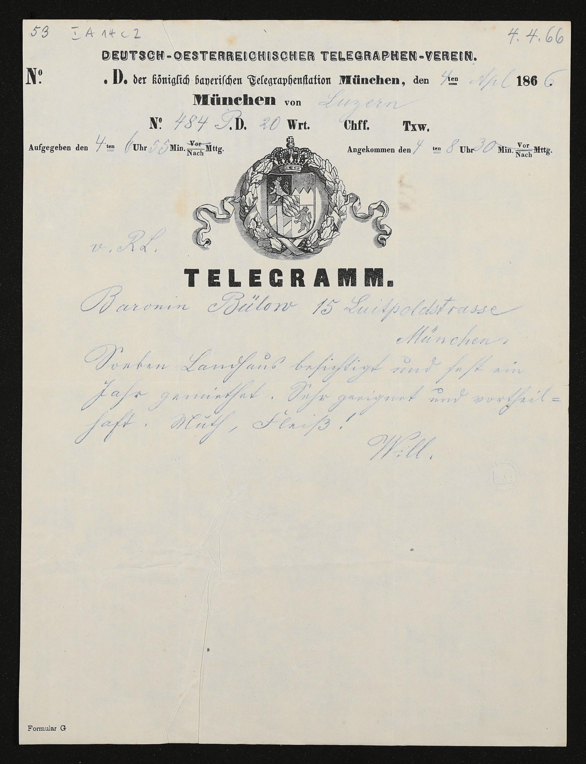 Telegramm von Richard Wagner an Cosima von Bülow