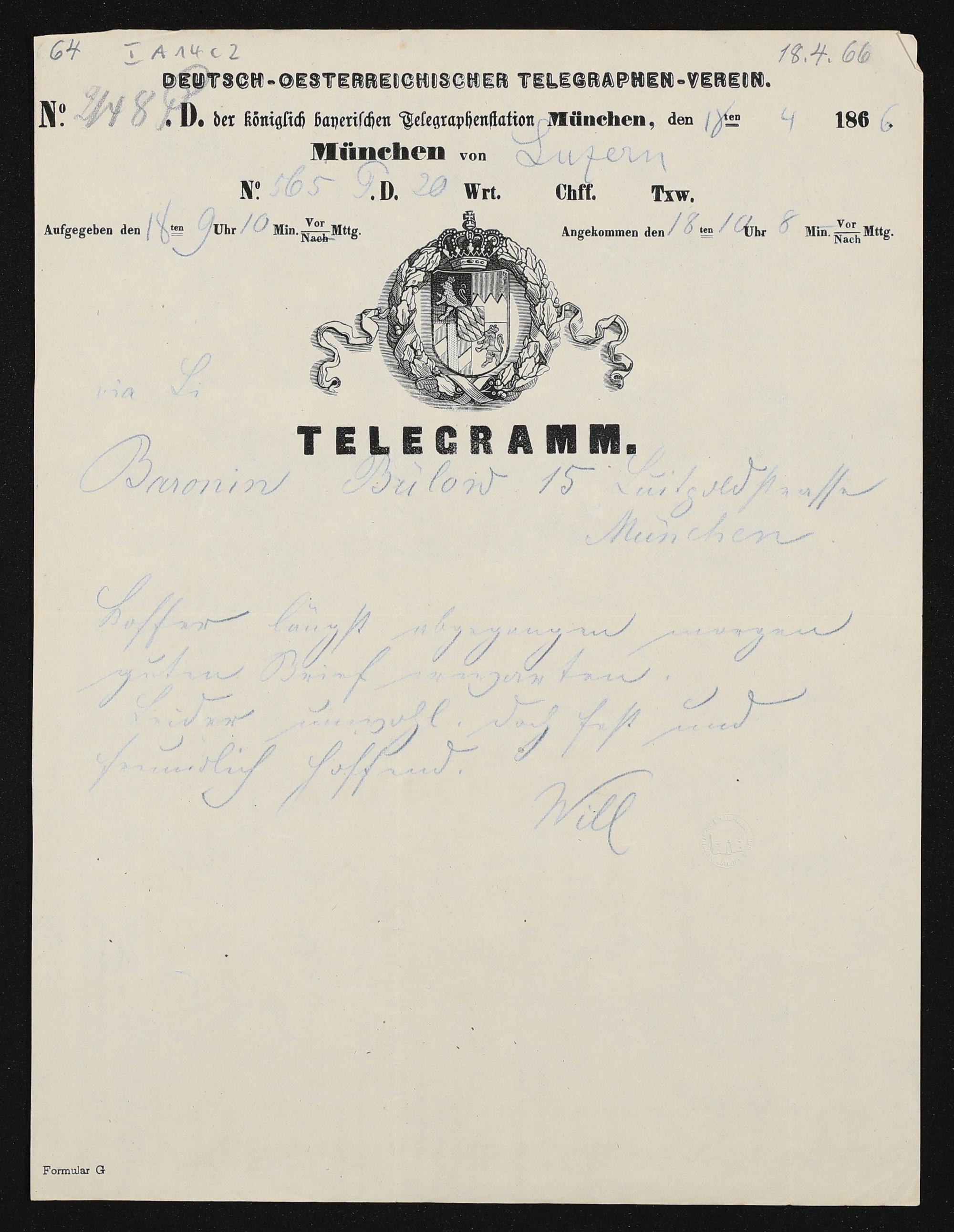 Telegramm von Richard Wagner an Cosima von Bülow