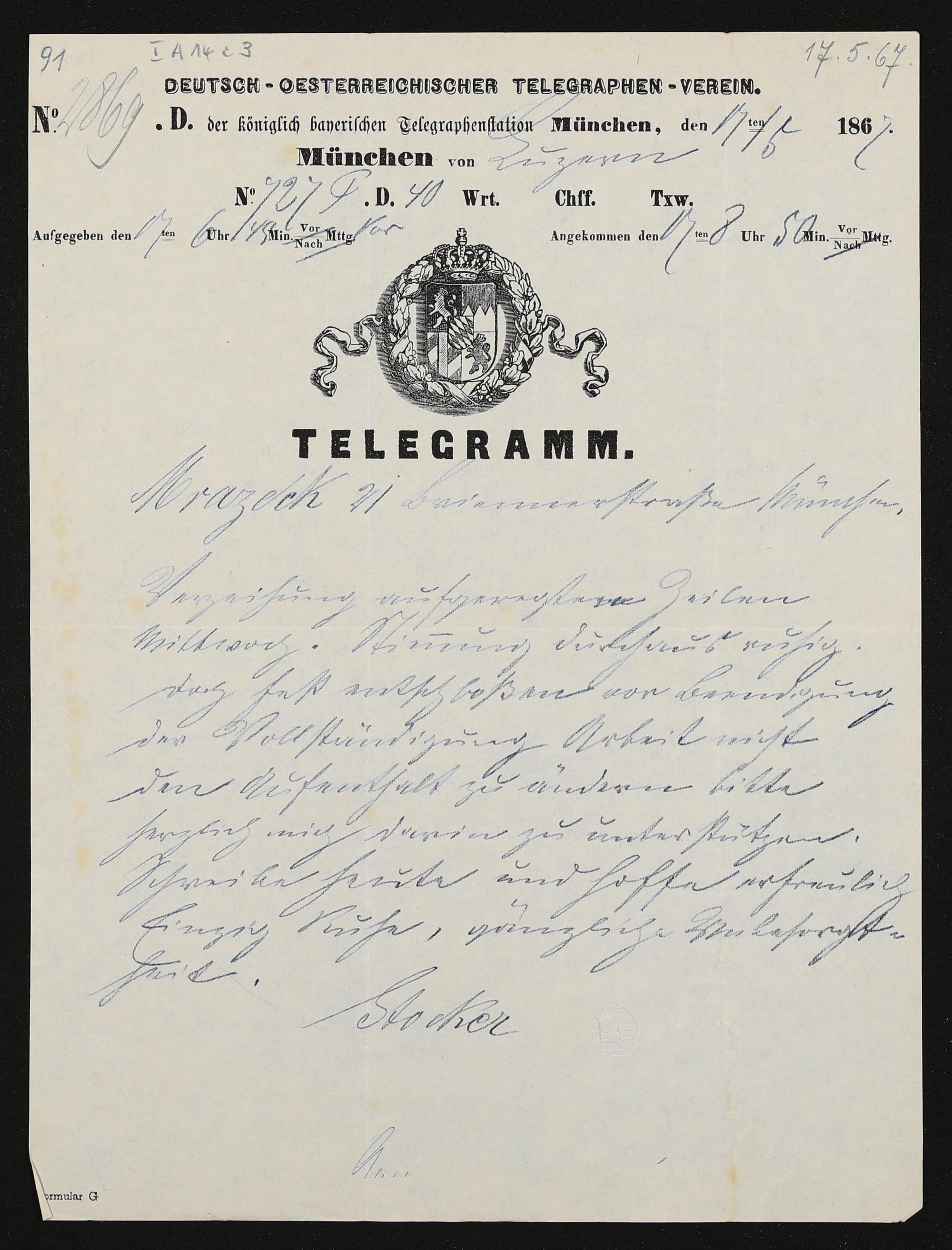 Telegramm von Jacob Stocker an Franz Mrazek