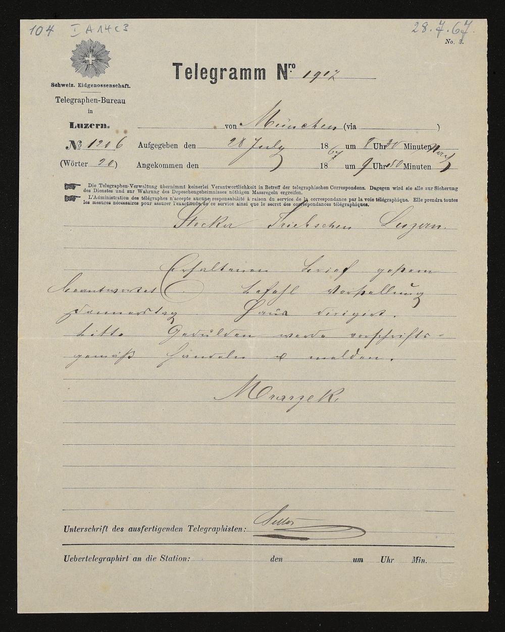 Telegramm von Franz Mrazek an Jacob Stocker