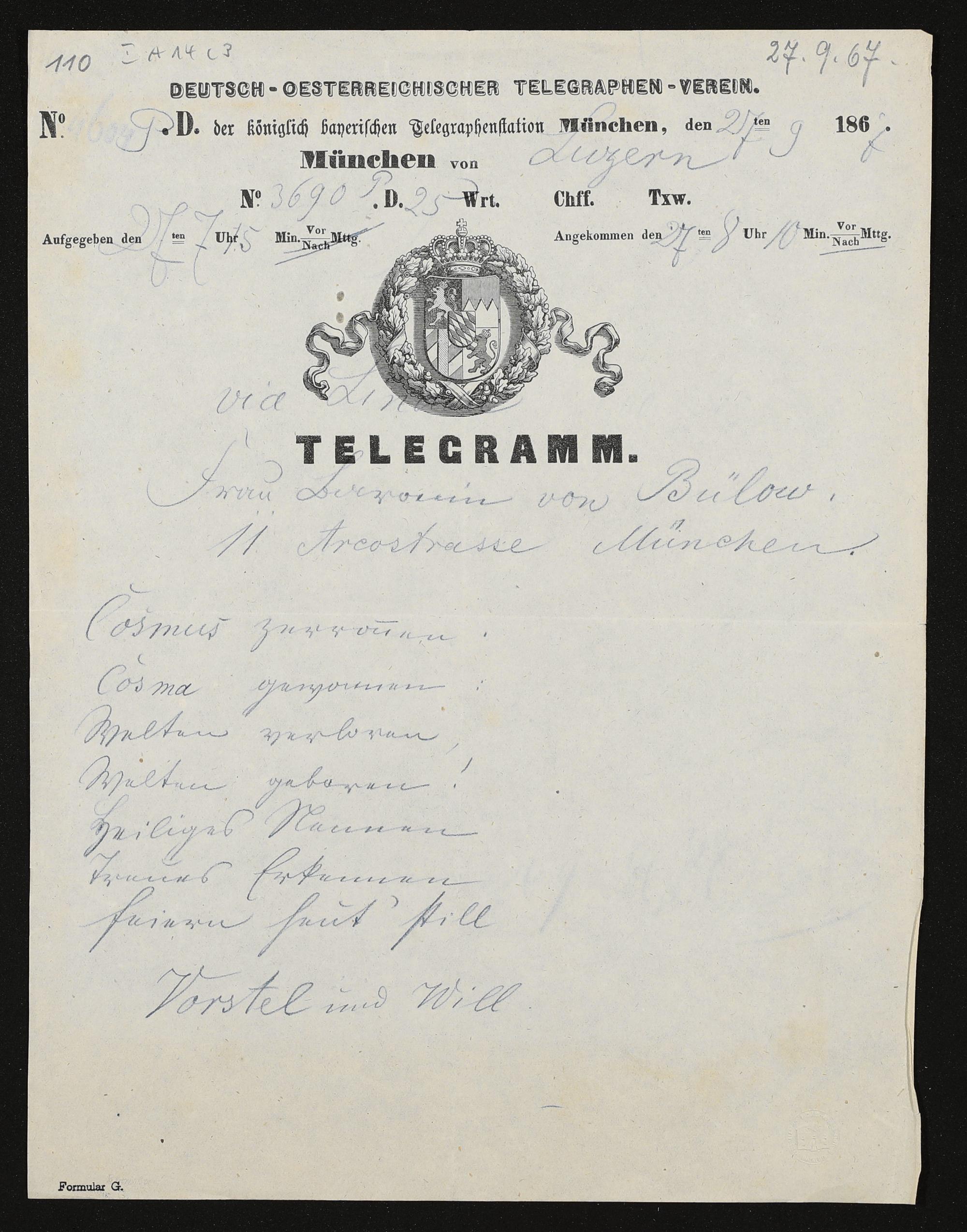 Telegramm von Richard Wagner an Cosima von Bülow