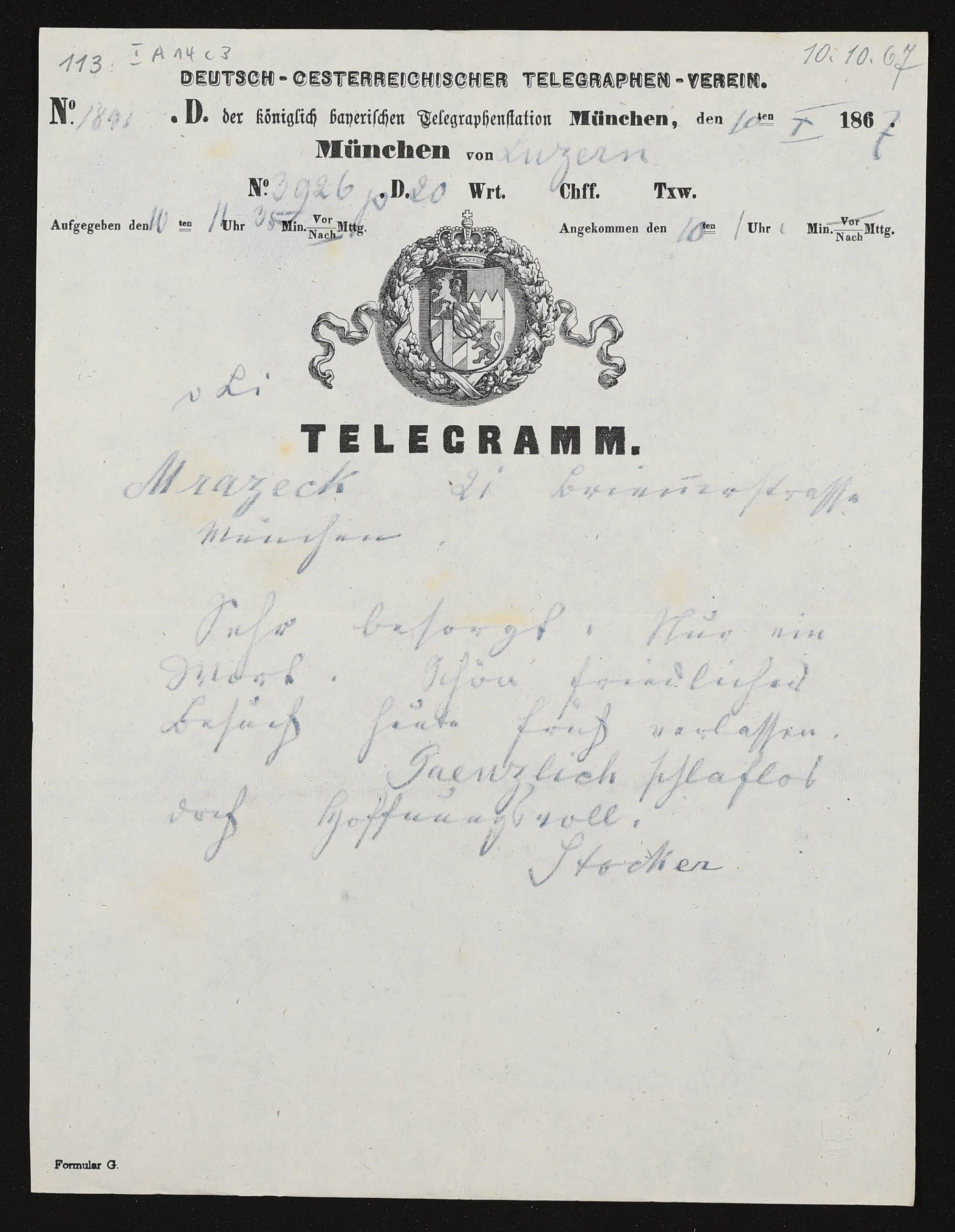 Telegramm von Jacob Stocker an Franz Mrazek