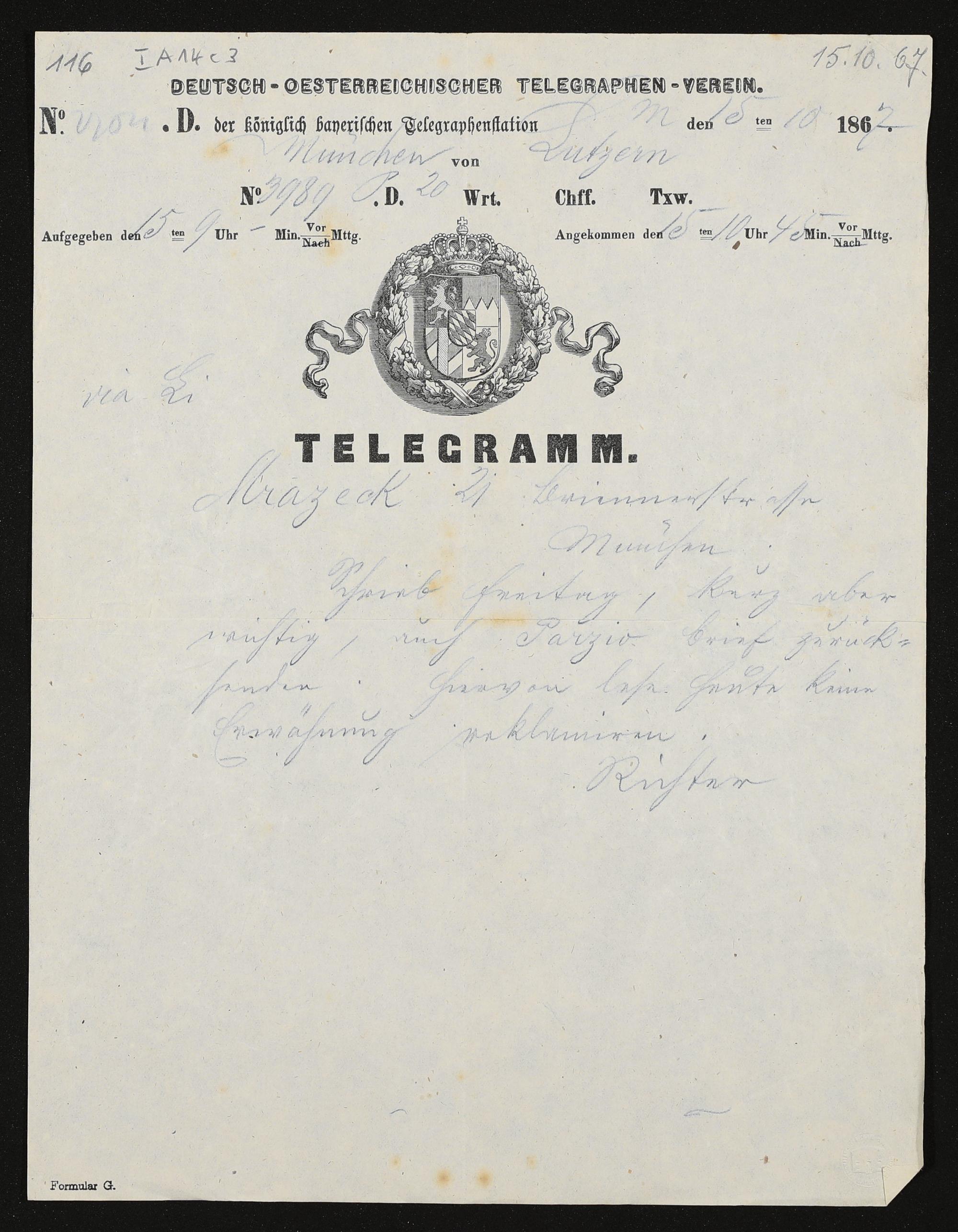 Telegramm mutmaßlich von Hans Richter an Franz Mrazek