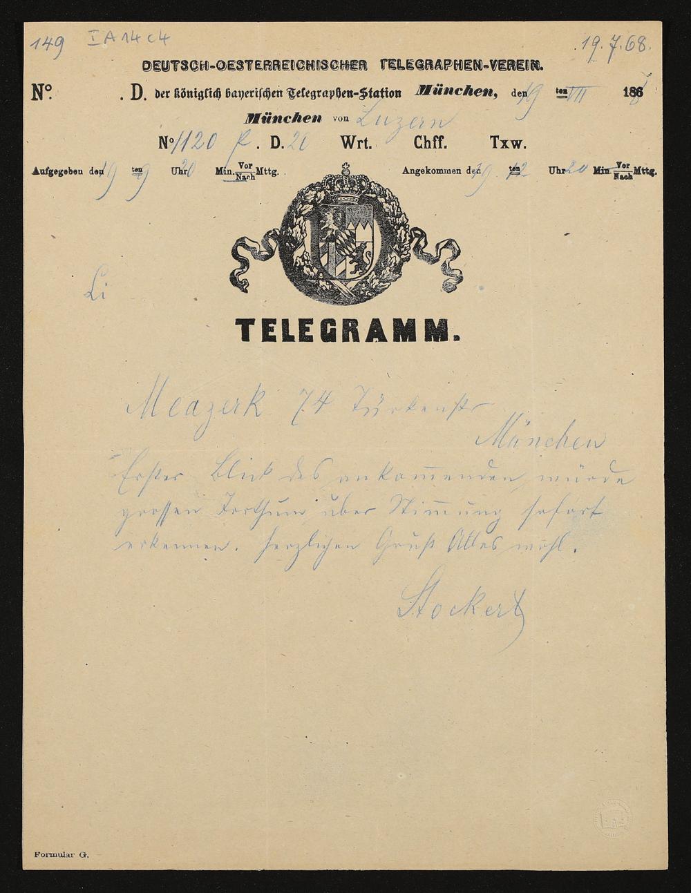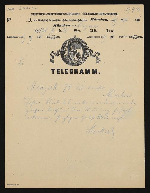 Telegramm von Jacob Stocker an Franz Mrazek