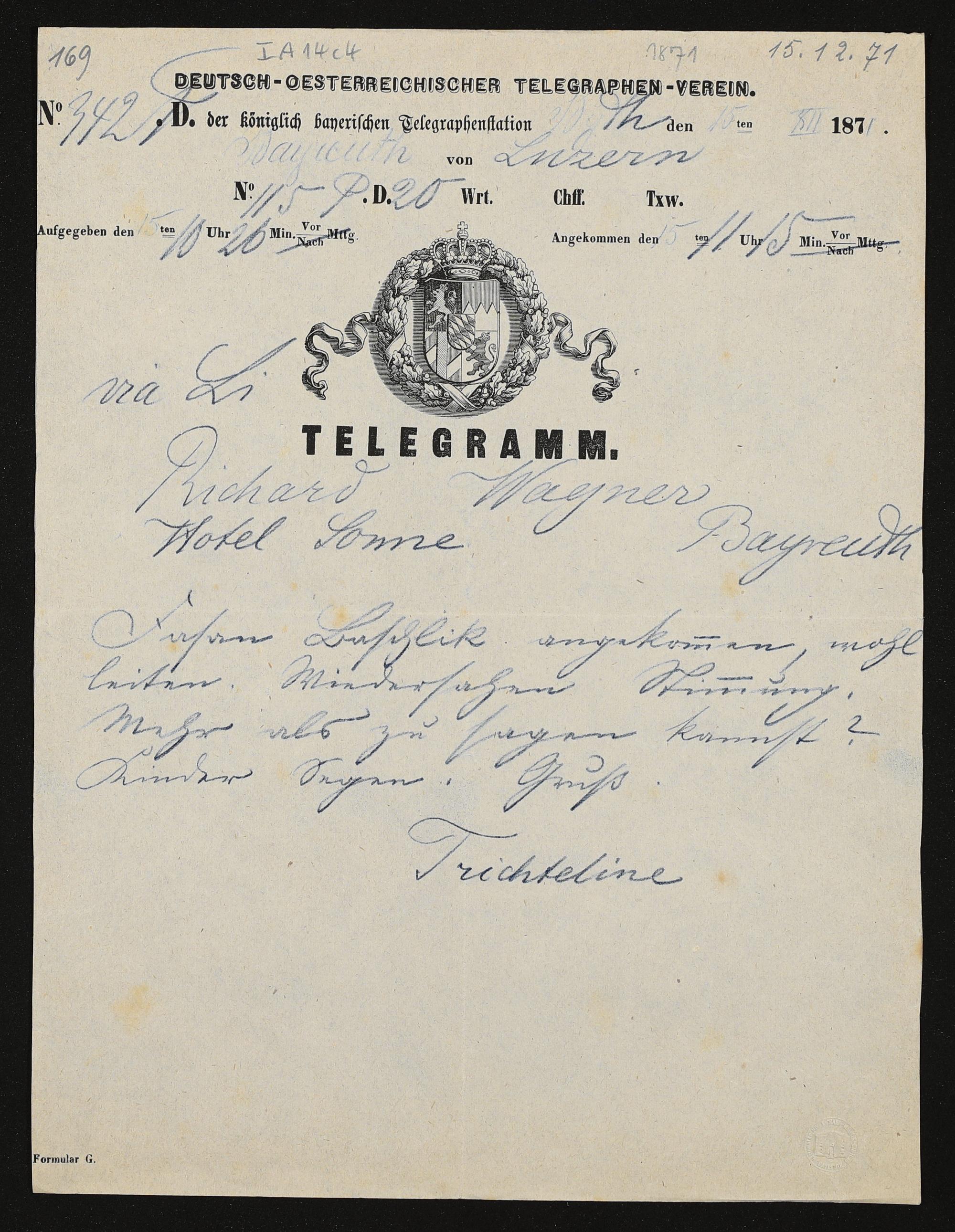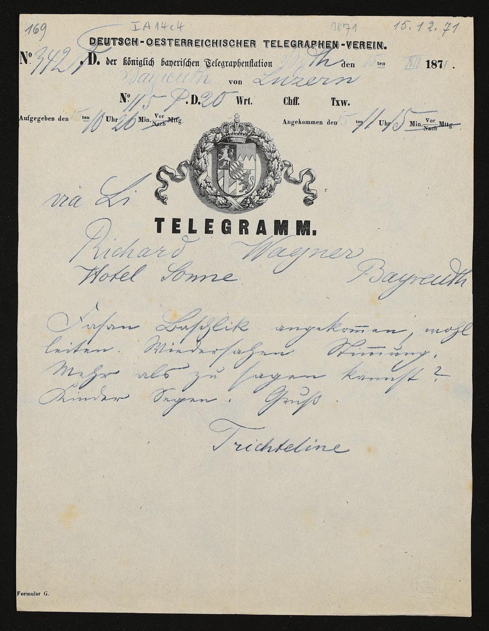 Telegramm von einer unbekannten Absenderin an Richard Wagner
