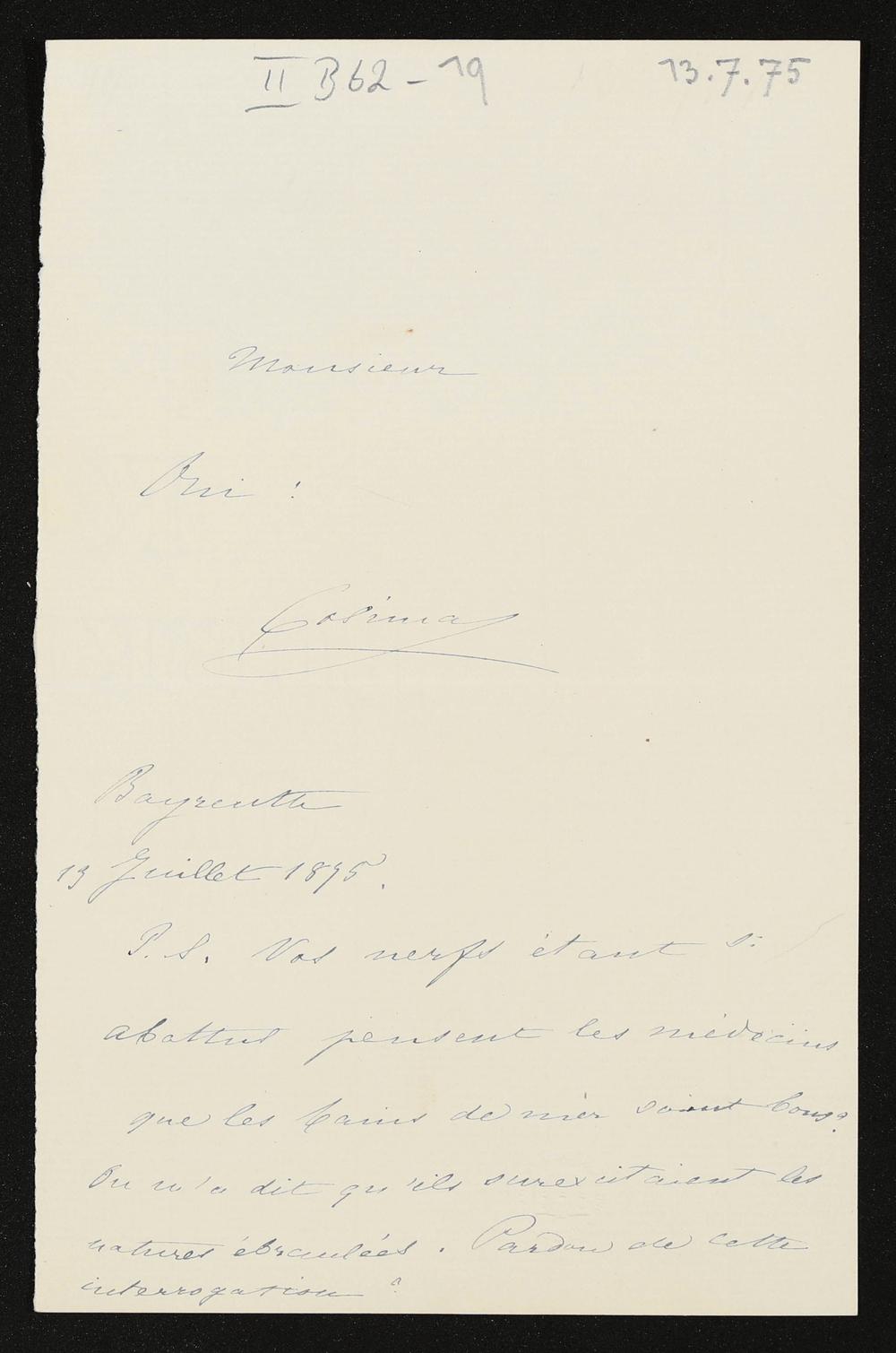 eigenhändiger Brief von Cosima Wagner an Hans von Bülow