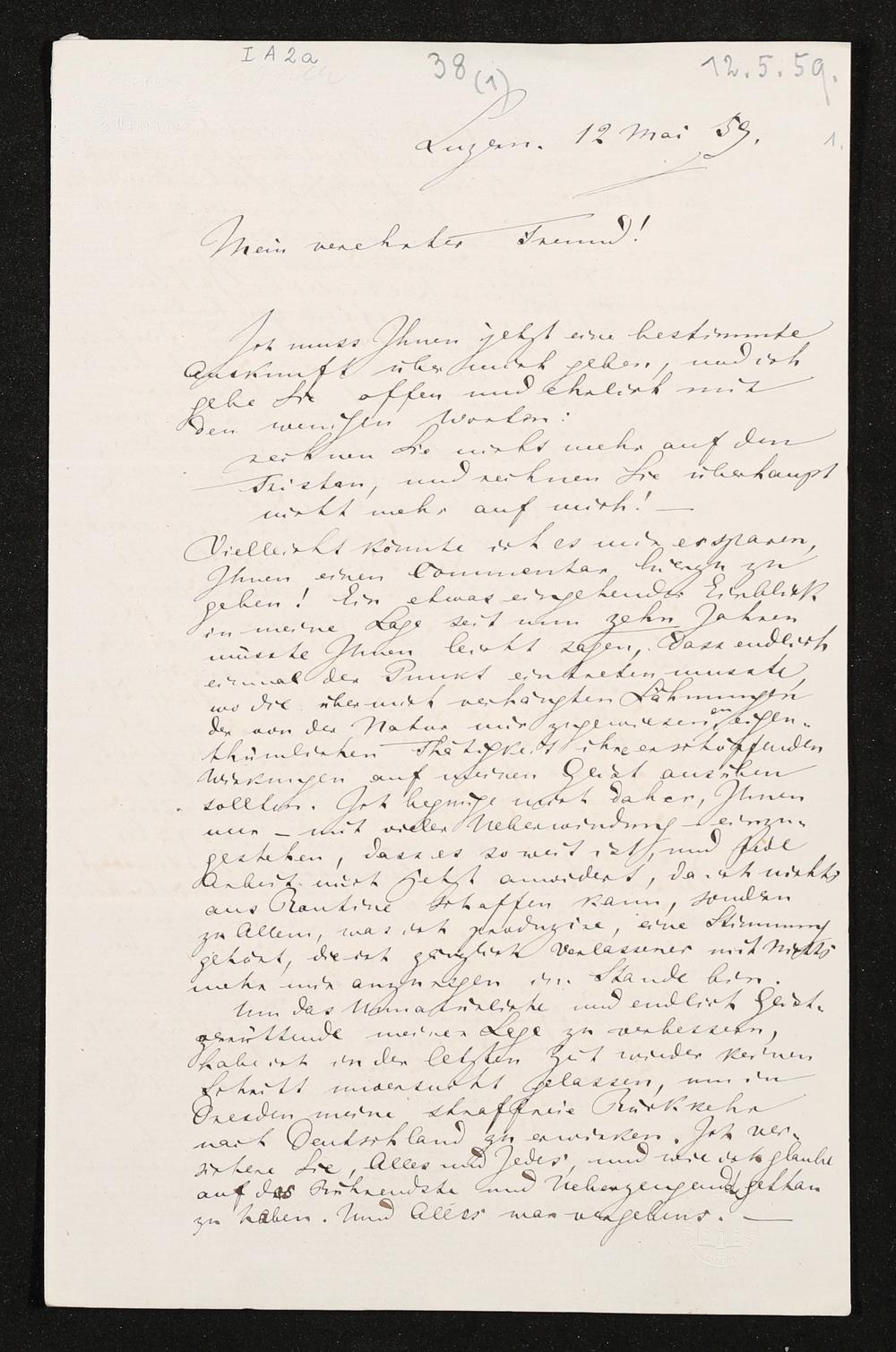 eigenhändiger Brief von Richard Wagner an Eduard Devrient