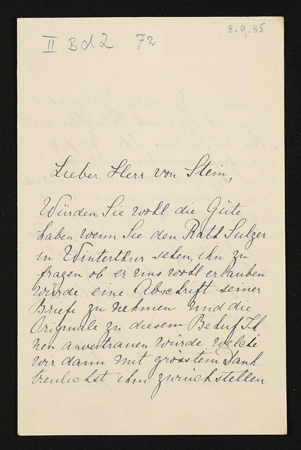 eigenhändiger Brief von Eva Wagner an Heinrich Freiherr von Stein