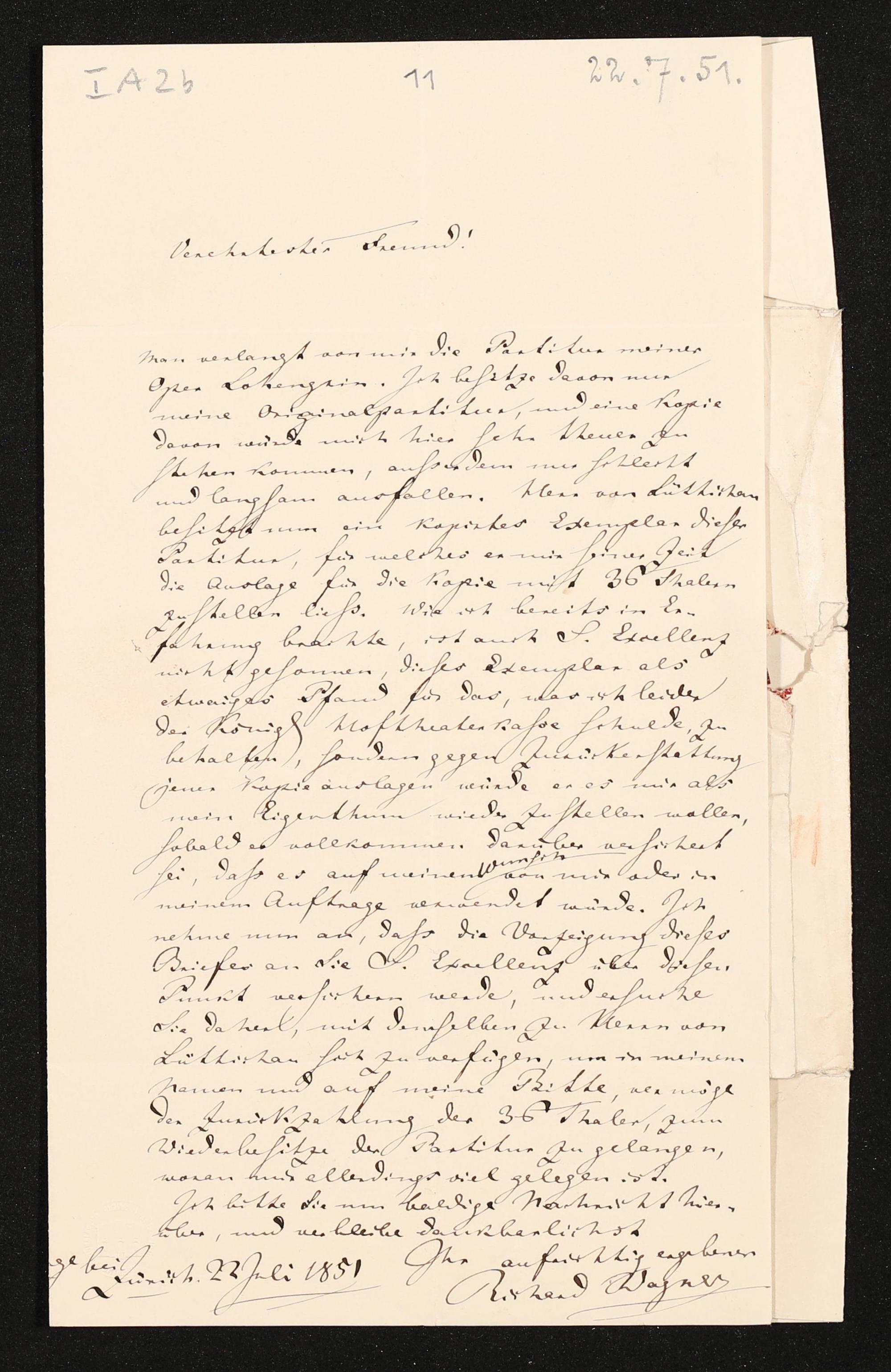 eigenhändiger Brief von Richard Wagner an WIlhelm Fischer