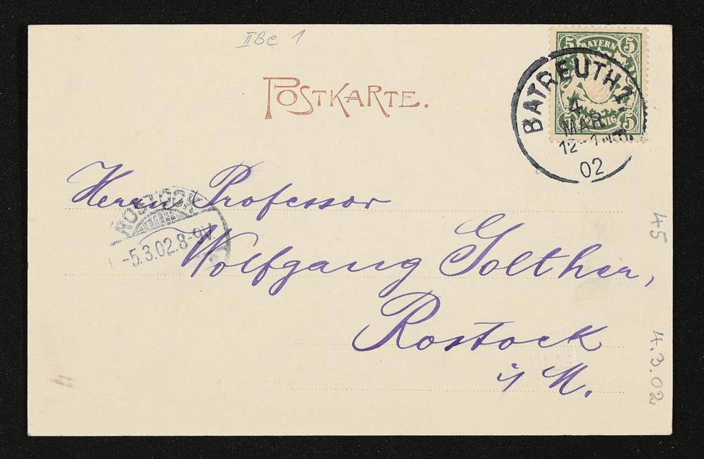 eigenhändige Postkarte von Cosima Wagner an Wolfgang Golther