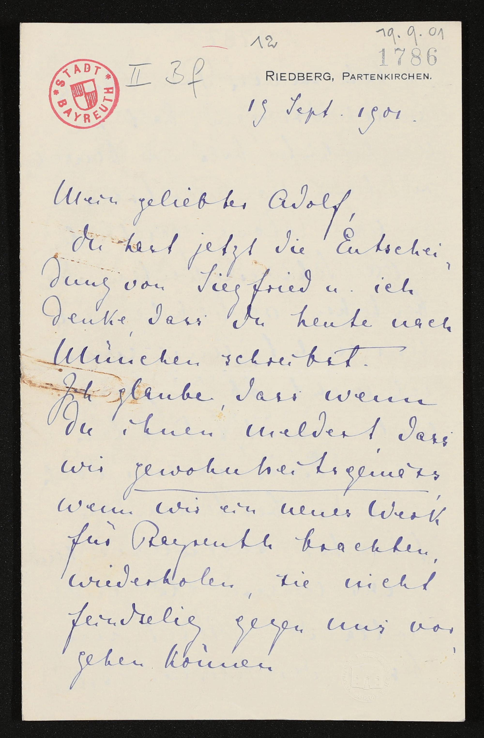 eigenhändiger Brief von Cosima Wagner an Adolf von Gross