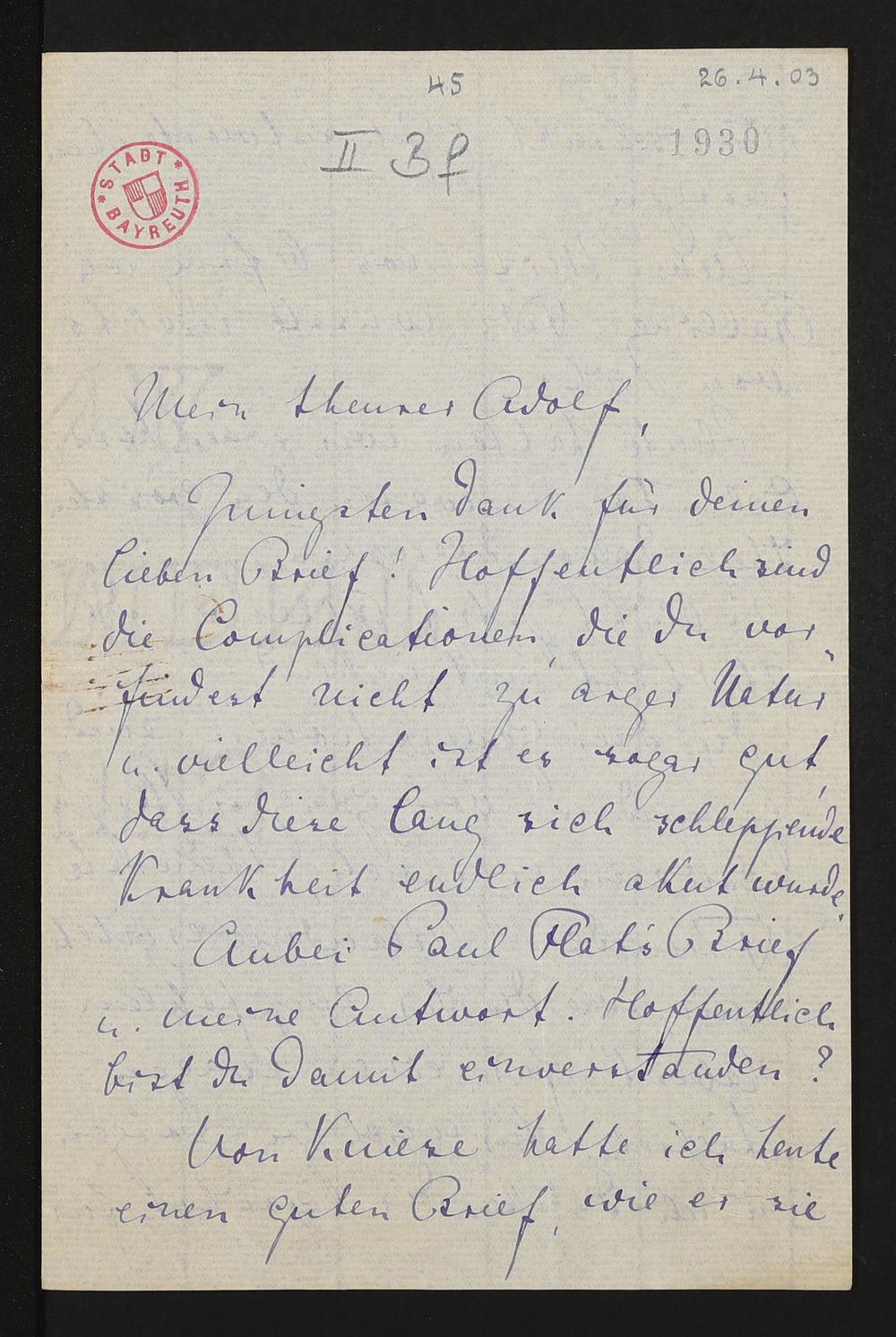 eigenhändiger Brief von Cosima Wagner an Adolf von Gross