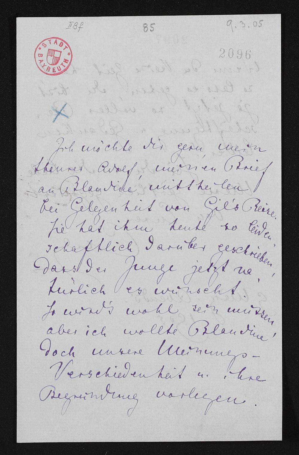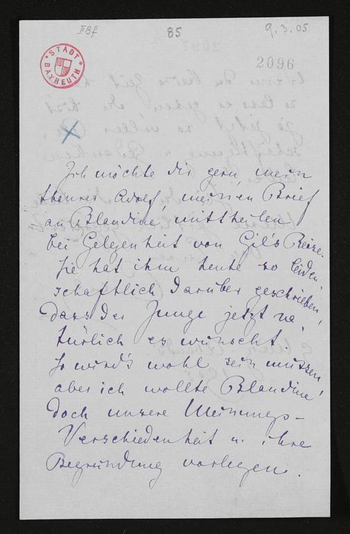 eigenhändiger Brief von Cosima Wagner an Adolf von Gross