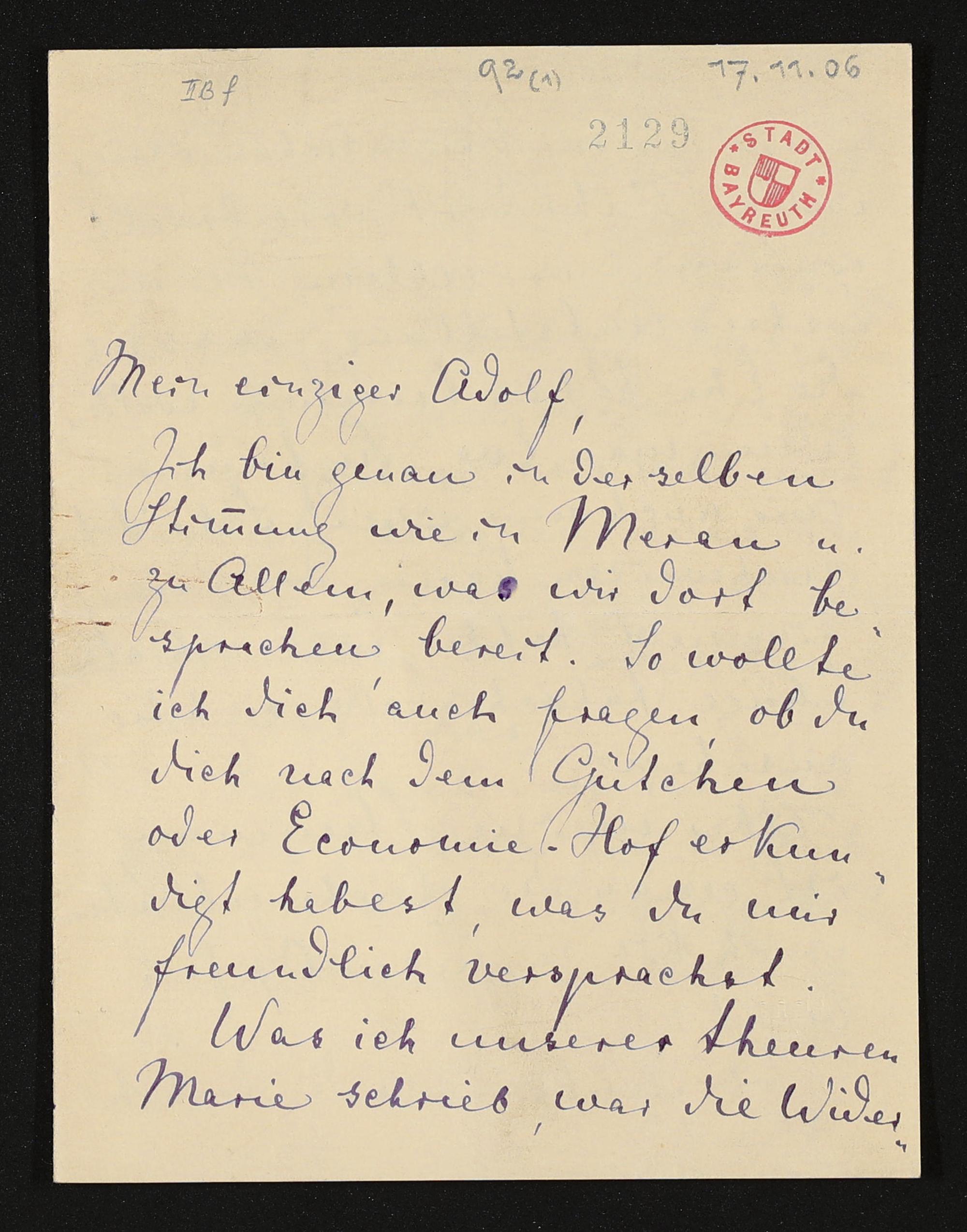 eigenhändiger Brief von Cosima Wagner an Adolf von Gross