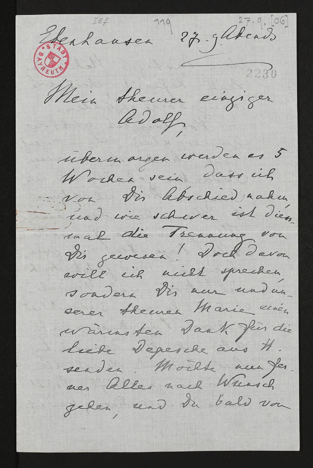 eigenhändiger Brief von Cosima Wagner an Adolf von Gross