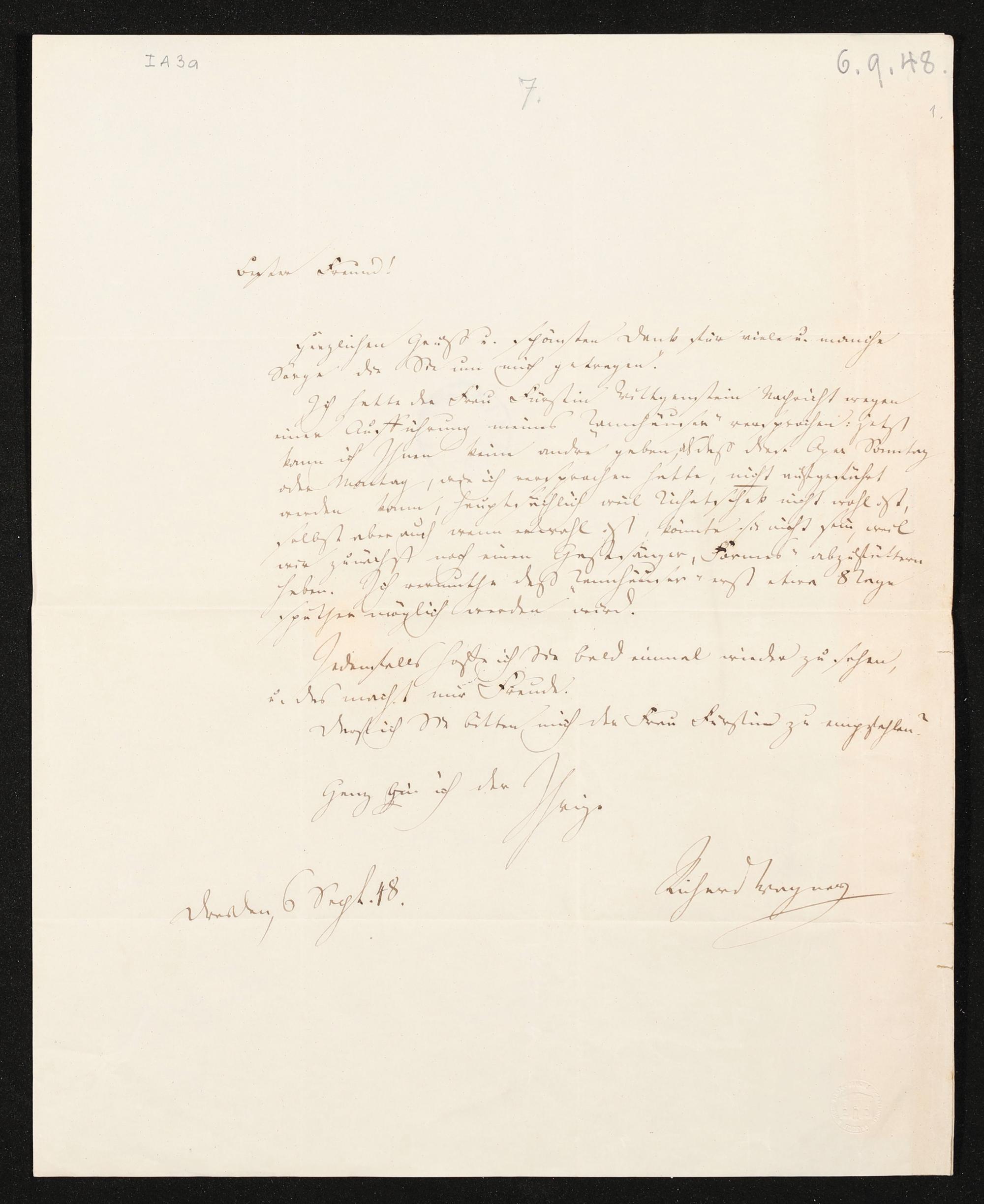 eigenhändiger Brief von Richard Wagner an Franz Liszt