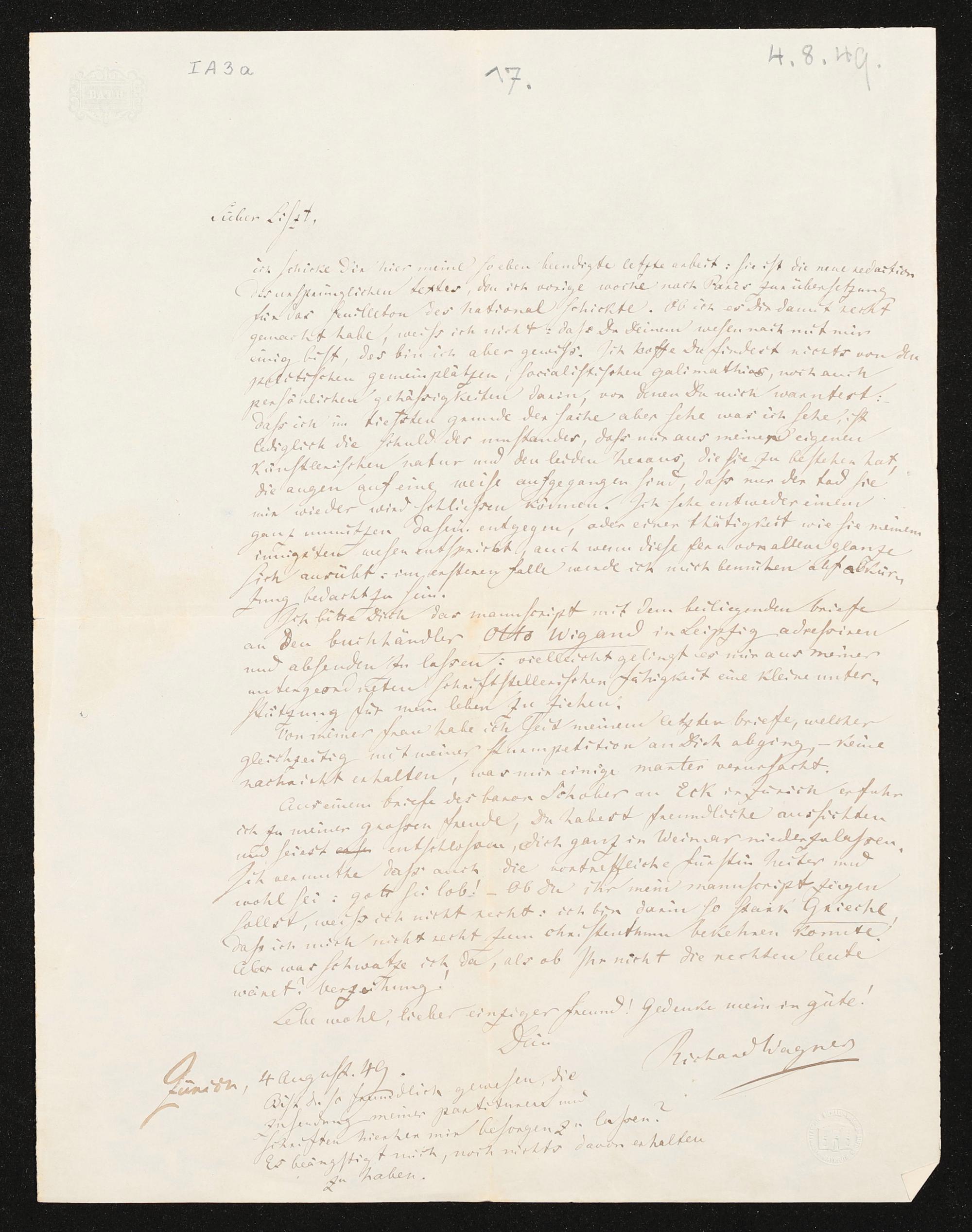 eigenhändiger Brief von Richard Wagner an Franz Liszt