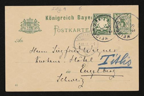 eigenhändige Postkarte von Cosima Wagner an Siegfried Wagner