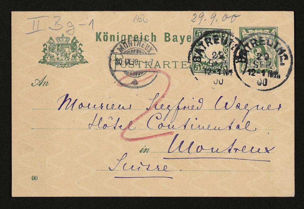 eigenhändige Postkarte von Cosima Wagner an Siegfried Wagner