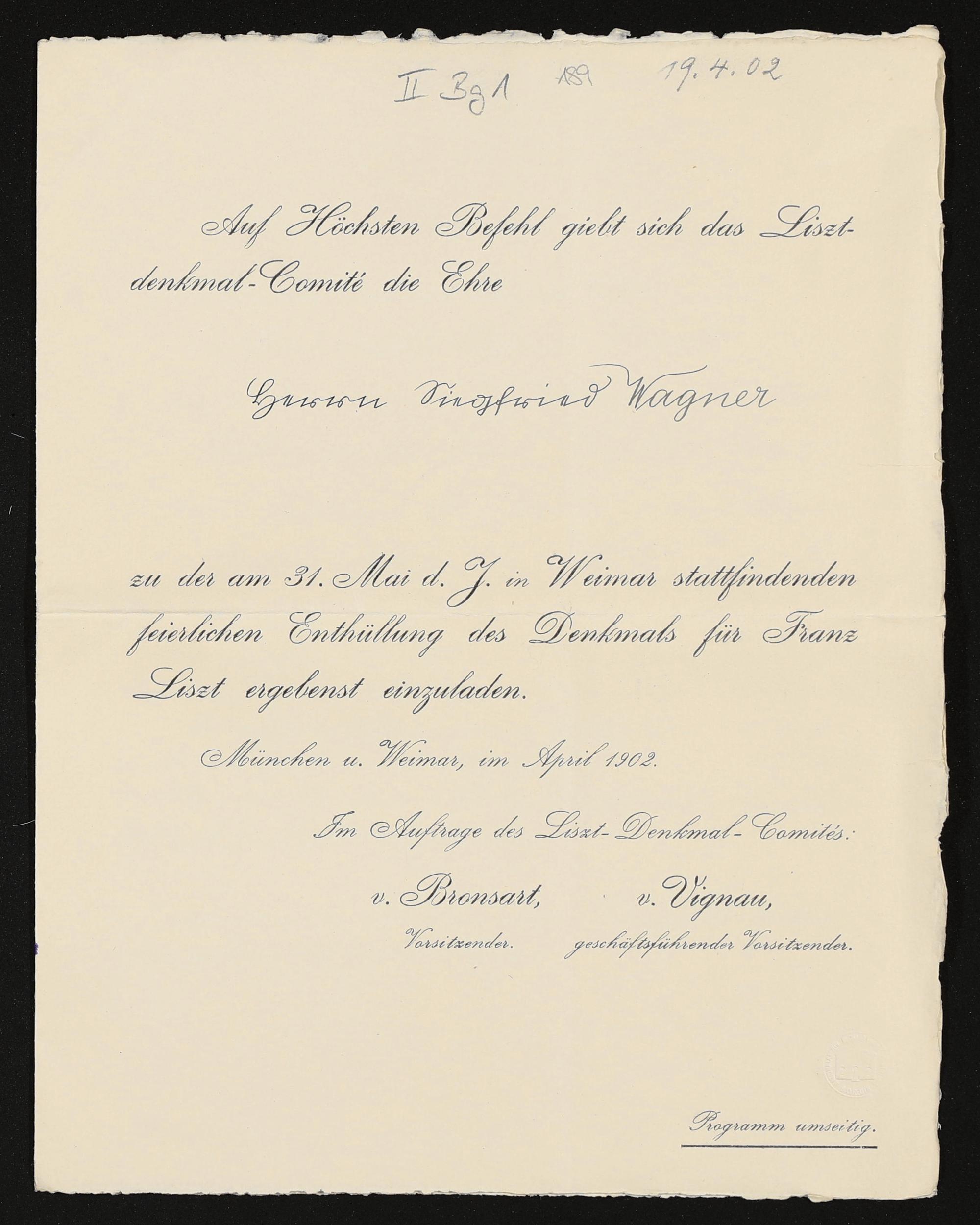 eigenhändiger Brief von Cosima Wagner an Siegfried Wagner, eigenhändiger Brief von Hyppolyt von Vignau und Hans Bronsart von Schellendorf an Siegfried Wagner