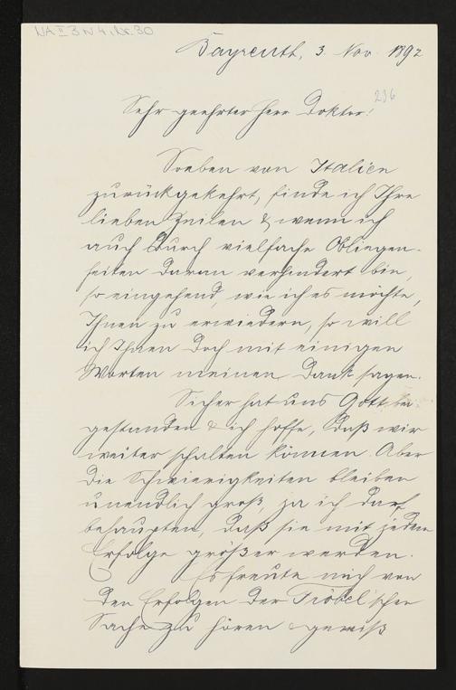 eigenhändiger Brief von Cosima Wagner an einen unbekannten Empfänger