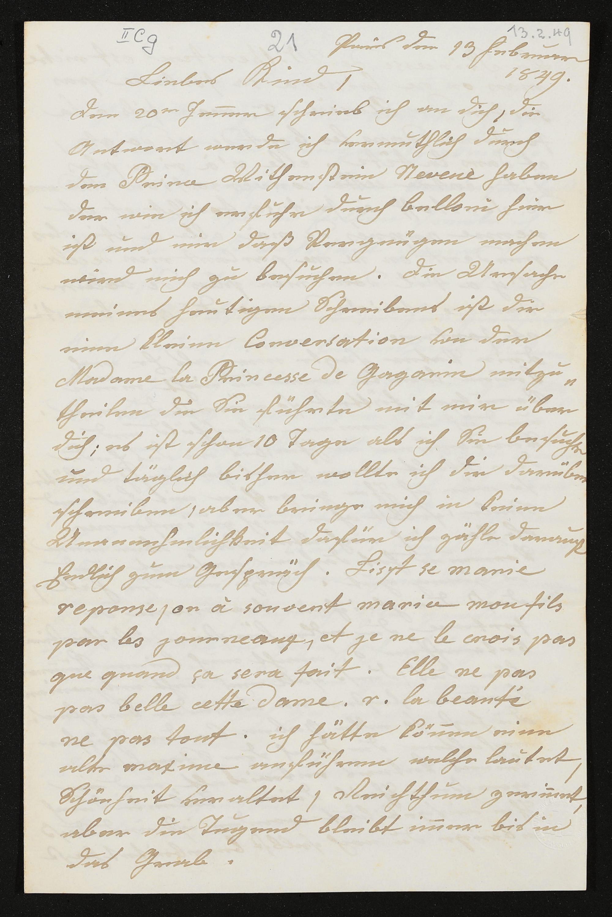 eigenhändiger Brief von Maria Anna Liszt an Franz Liszt