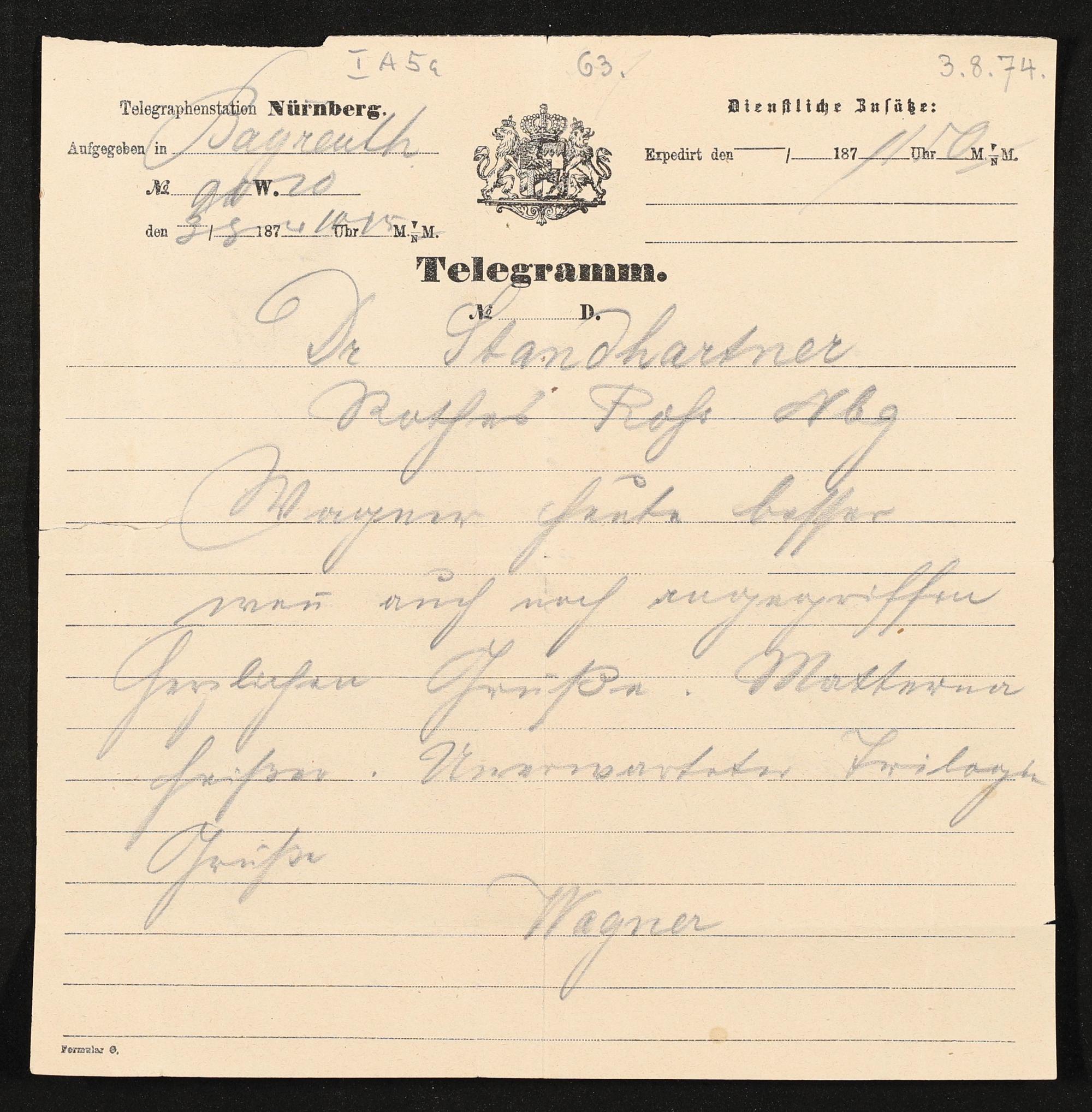 Telegramm von Richard Wagner an Josef Standhartner