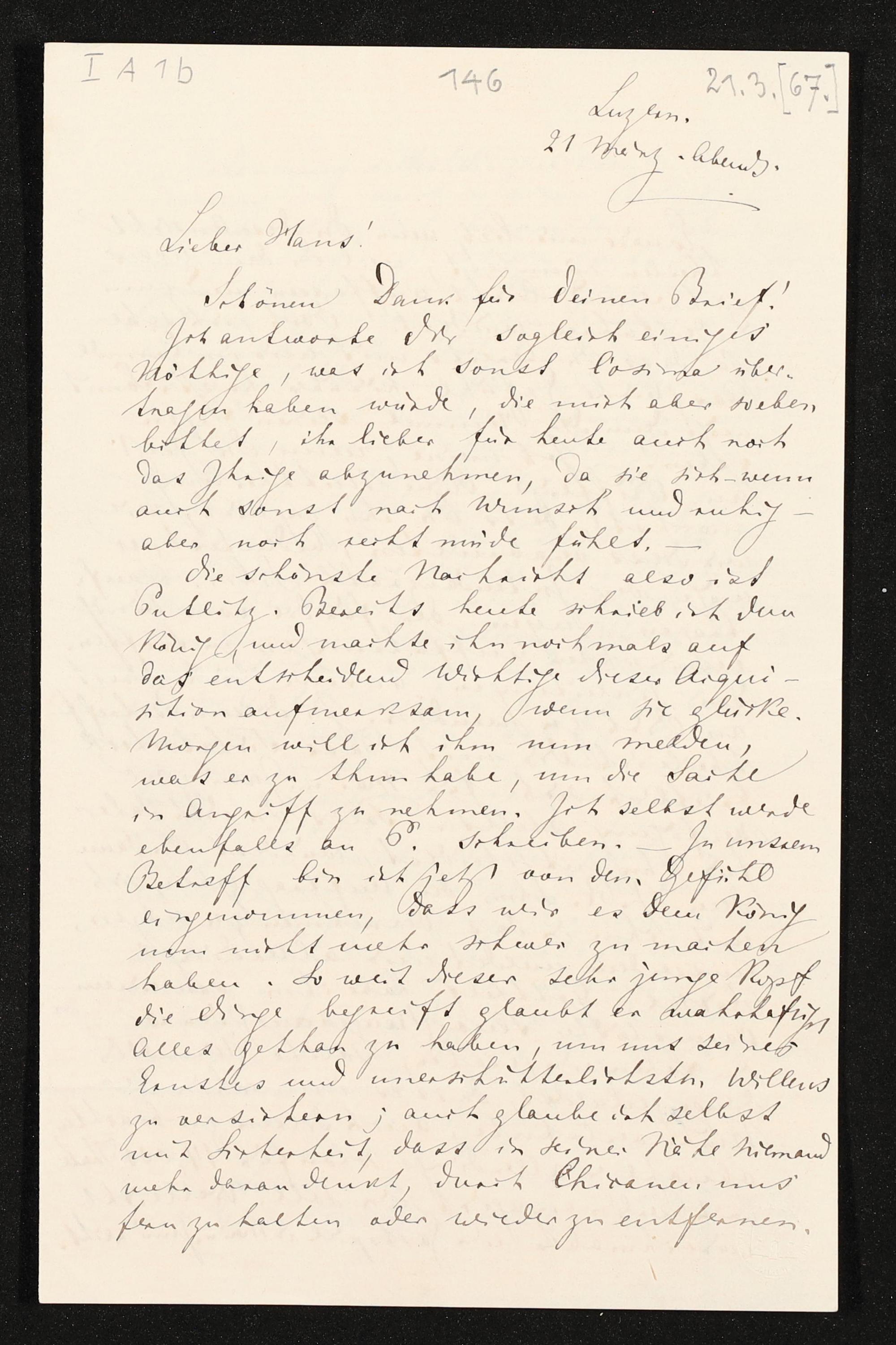eigenhändiger Brief von Richard Wagner an Hans von Bülow