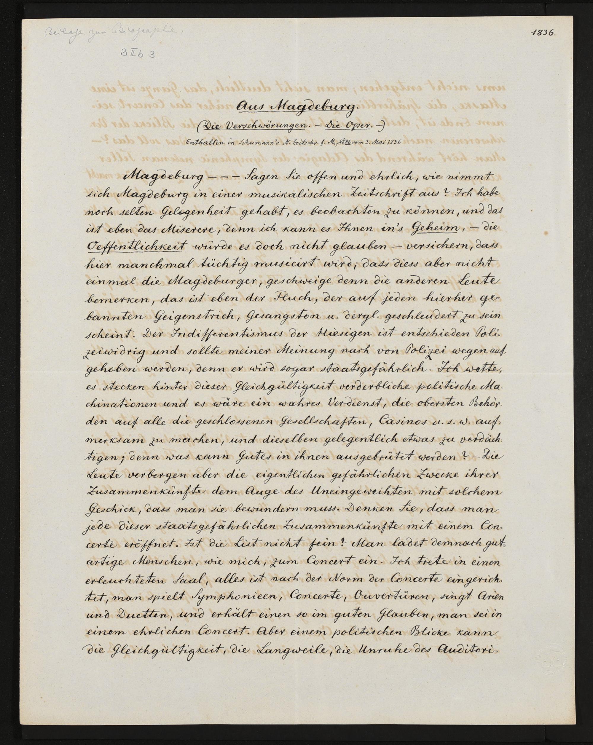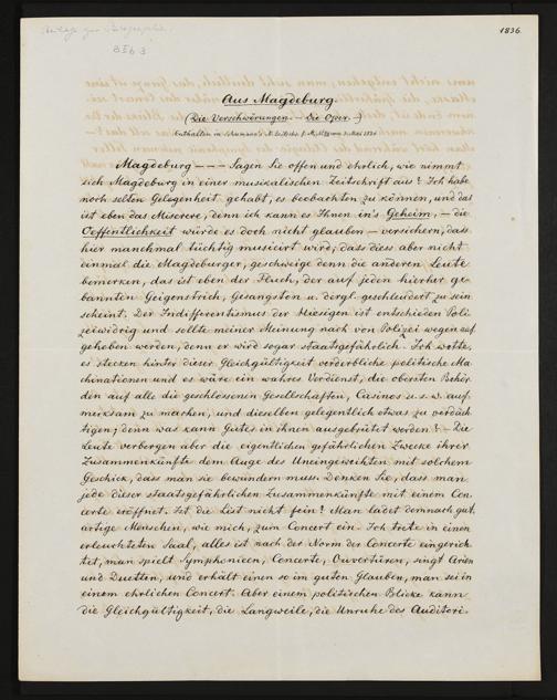 Aus Magdeburg. (Die Verschwörungen. - Die Oper.), Aufsatz von Richard Wagner; dazu: Brief von Richard Wagner an Robert Schumann, 19. April 1836; Abschriften von Carl Friedrich Glasenapp