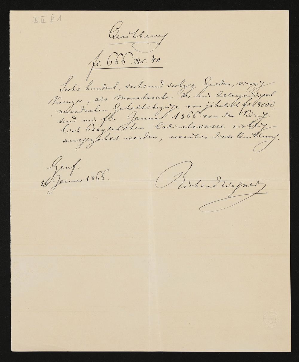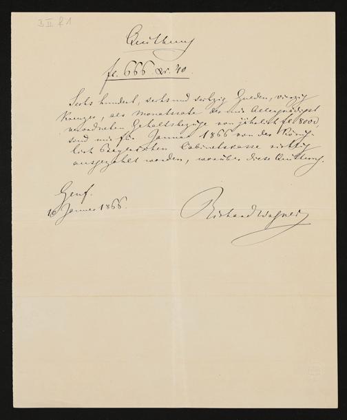 eigenhändige Quittung von Richard Wagner an die Königlich Bayerische Kabinettskasse; beiliegend: eigenhändiges Konzept des Textes der Quittung von Richard Wagner