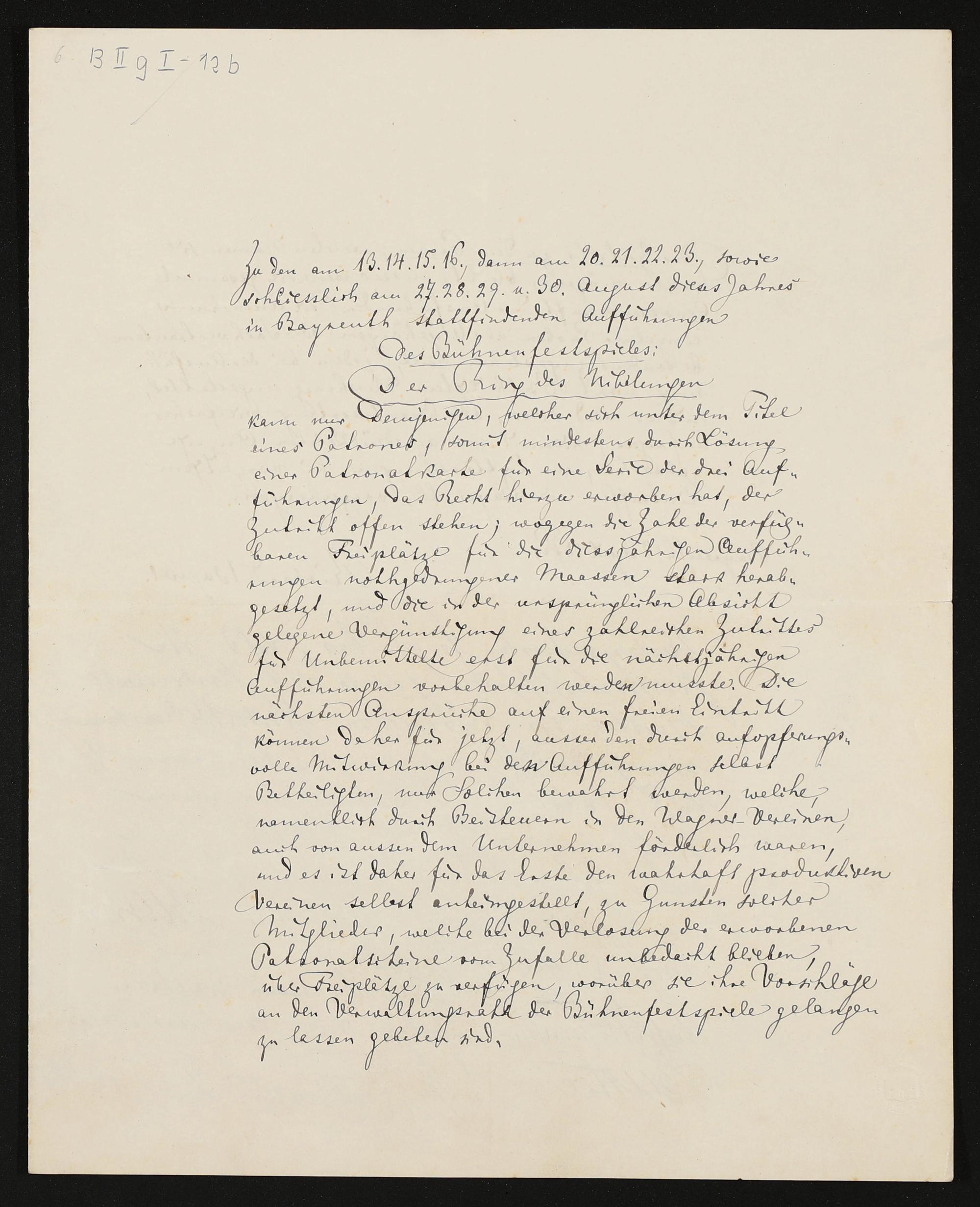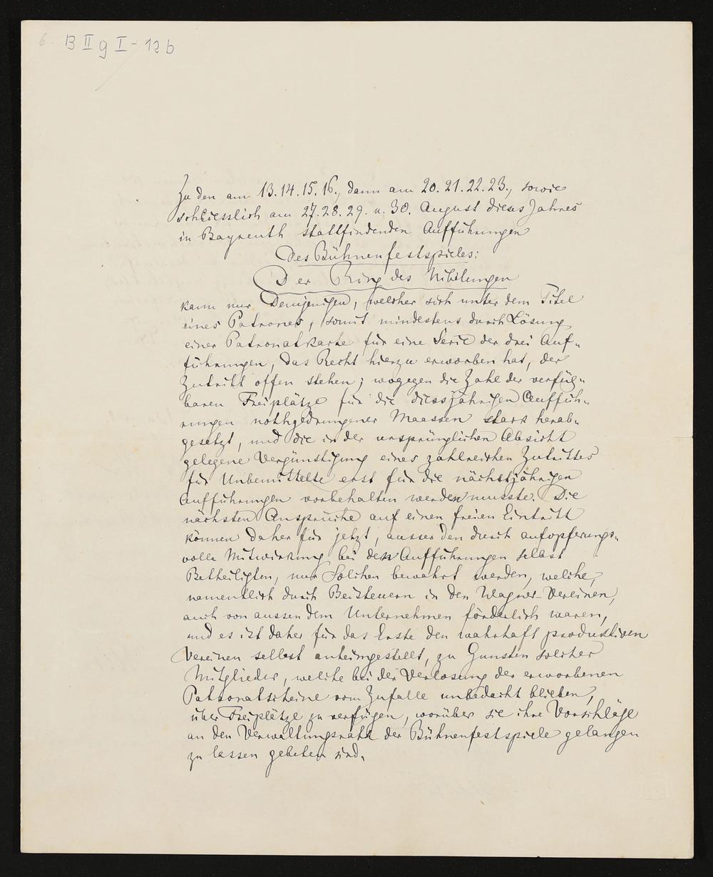 Für die Patrone: Ankündigung der Festspielaufführungen 1876, eigenhändige Reinschrift von Richard Wagner, eigenhändige Zeilen von Friedrich Feustel