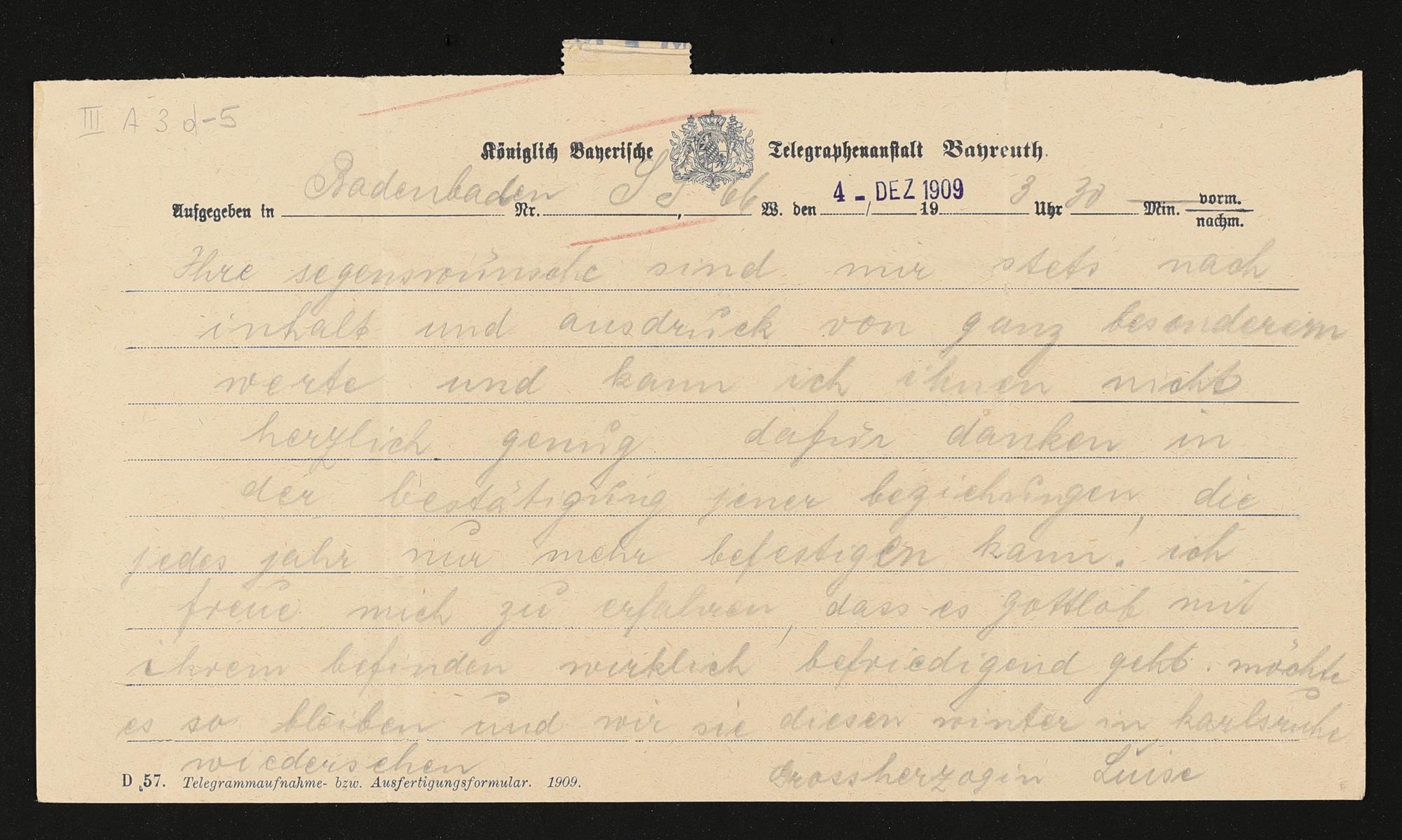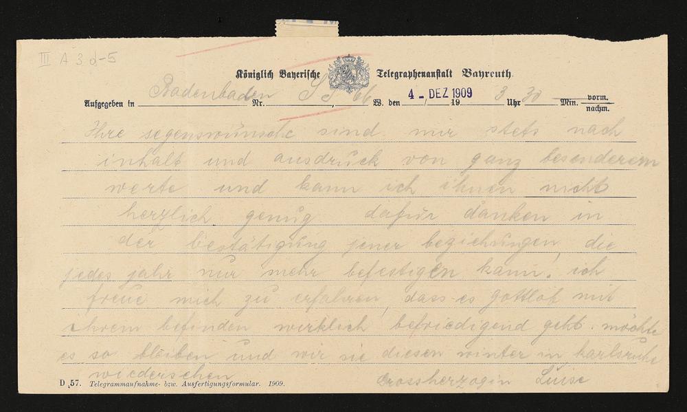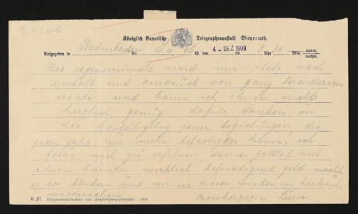 Telegramm von Großherzogin Luise von Baden an Cosima Wagner