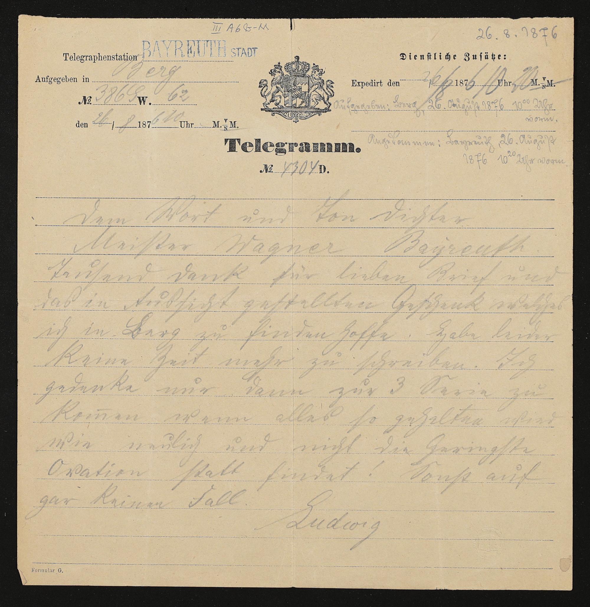 Telegramm von König Ludwig II. von Bayern an Richard Wagner