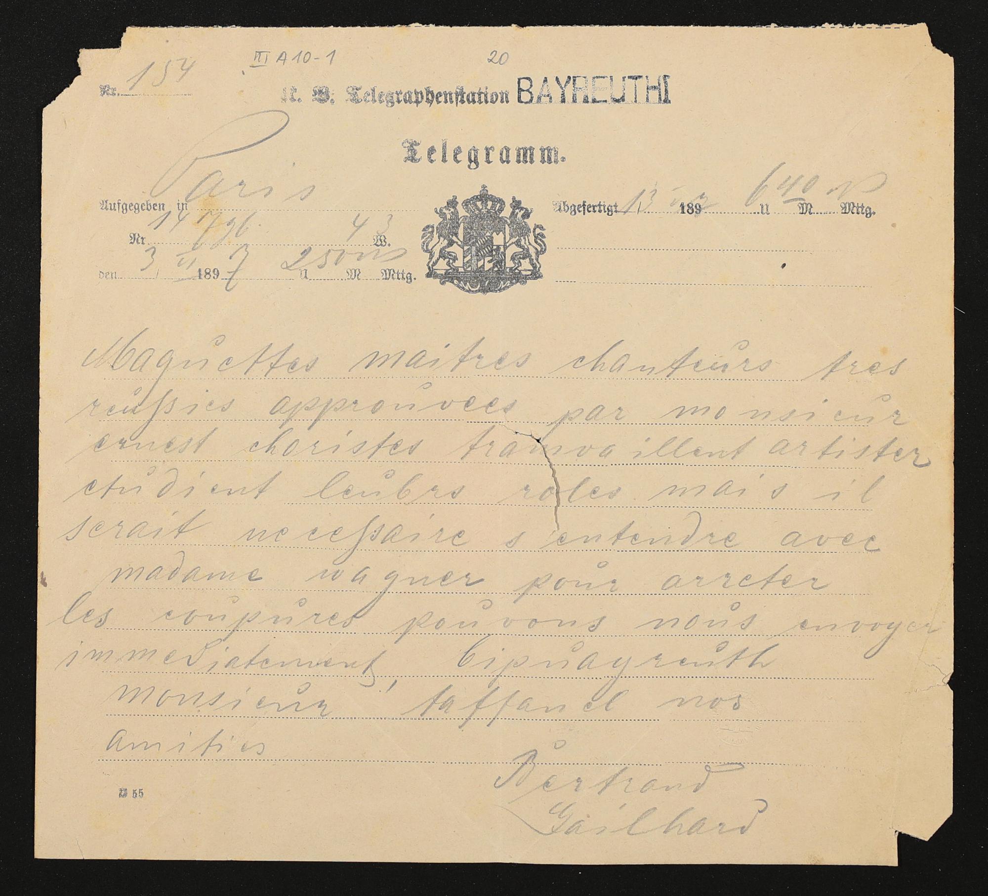 Telegramm mutmaßlich von Eugène Bertrand und Pierre Gailhard an Adolf von Gross