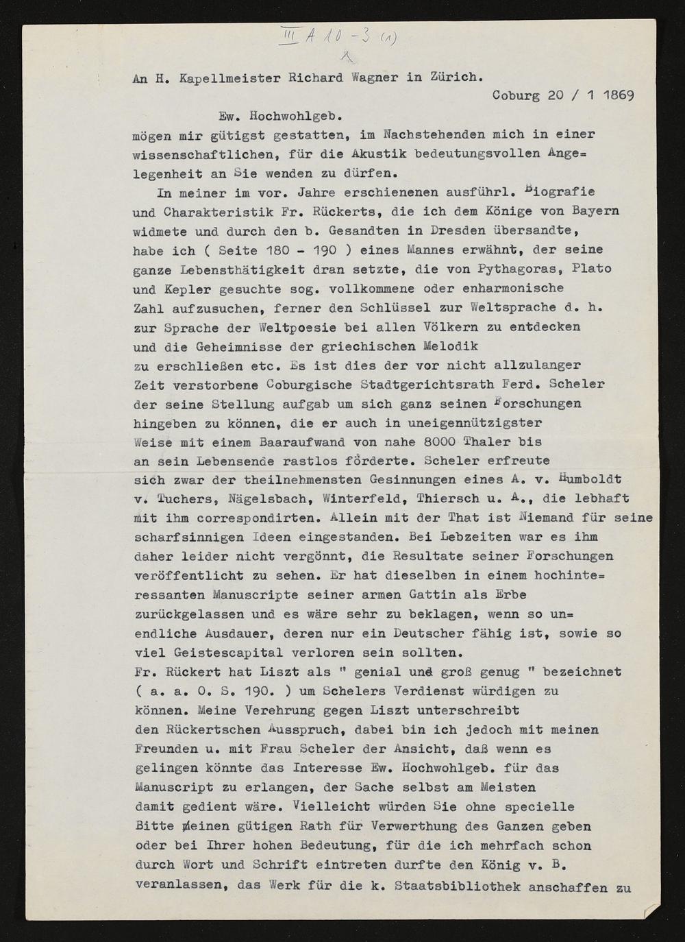 eigenhändiger Brief von Conrad Beyer an Richard Wagner