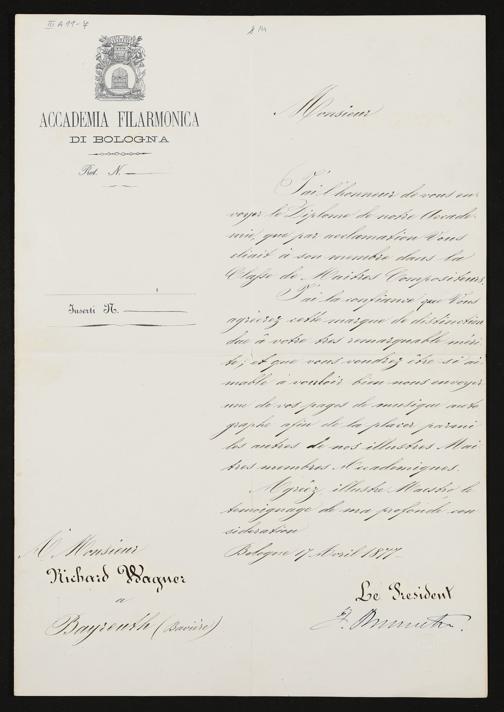 eigenhändiger Brief der Accademia Filarmonica di Bologna an Richard Wagner