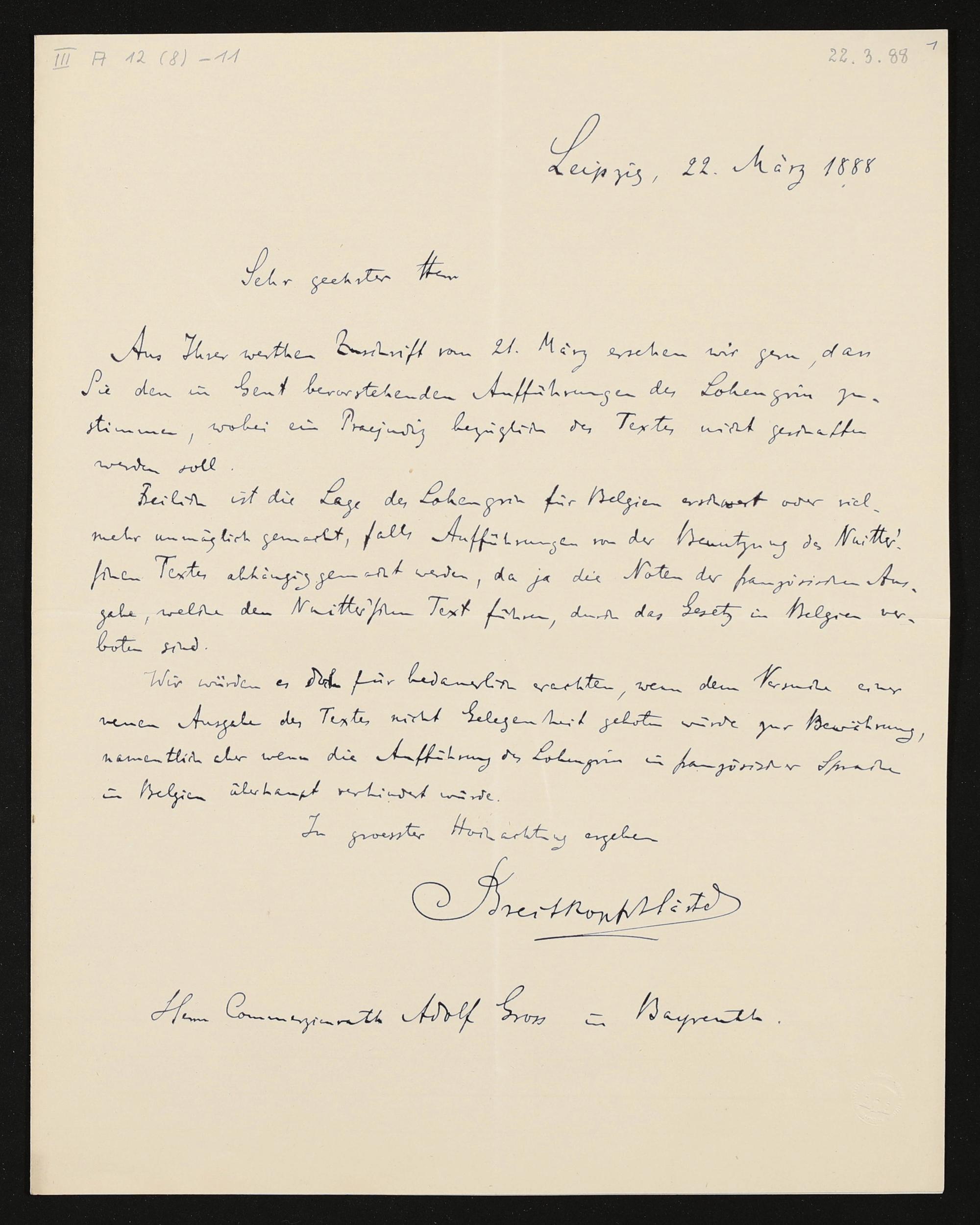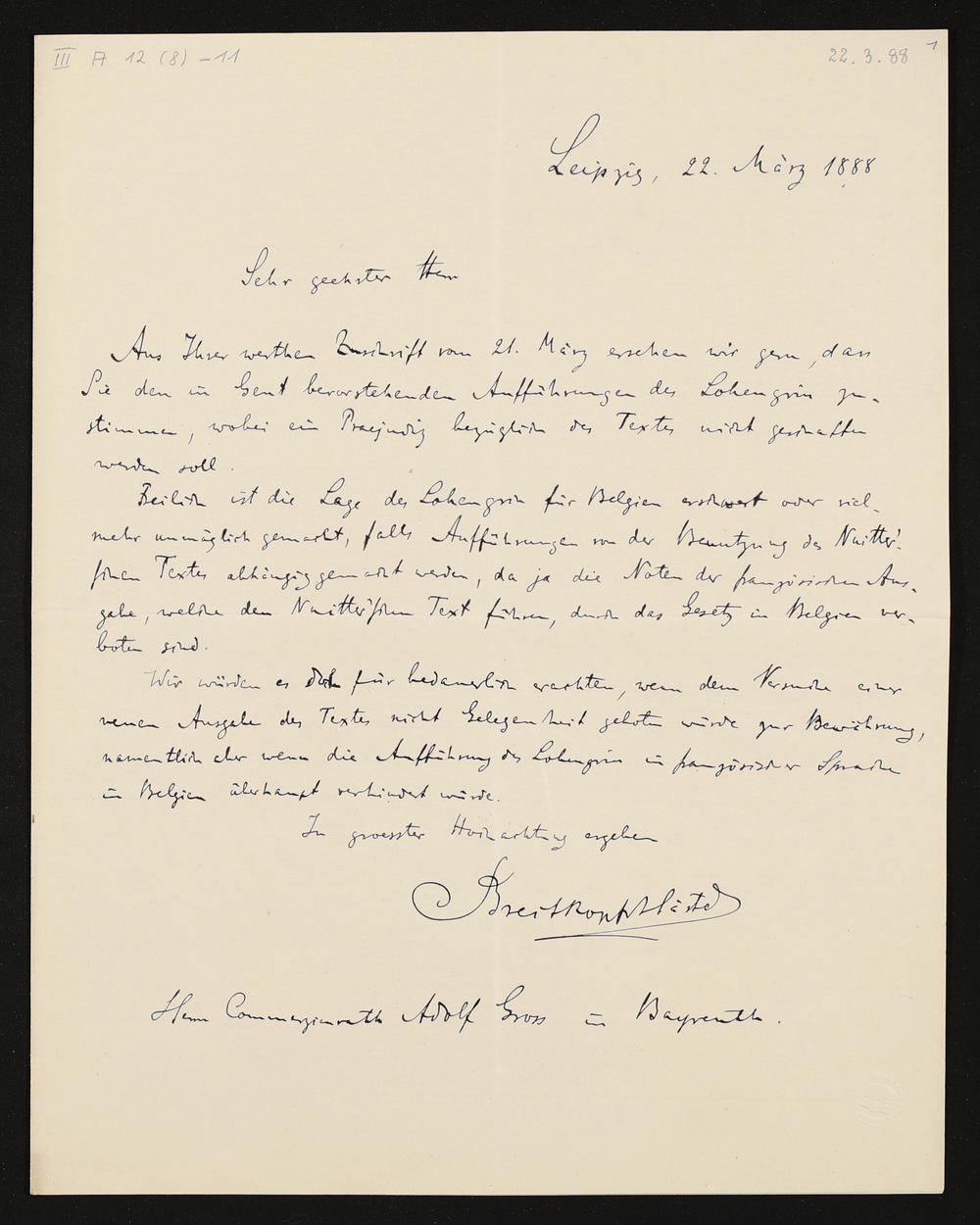 eigenhändiger Brief von Breitkopf & Härtel an Adolf von Gross