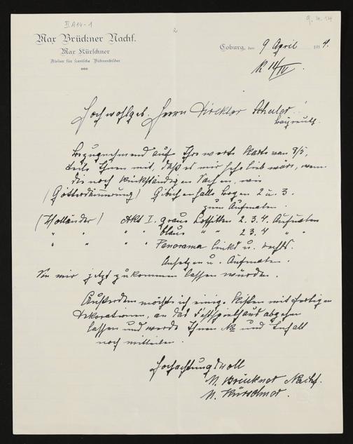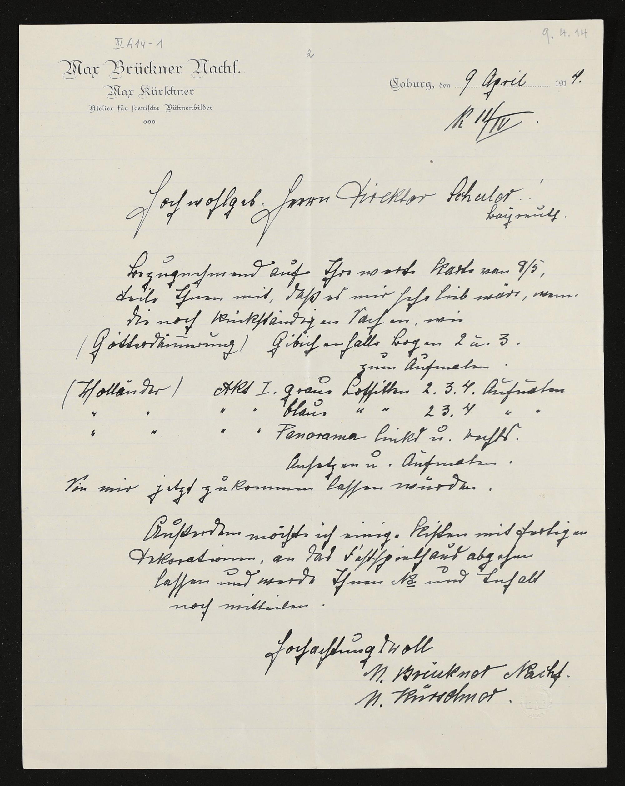 eigenhändiger Brief von Max Kürschner (Max Brückner Nachfolger Max Kürscher Atelier für scenische Bühnenbilder) an F. W. Schuler
