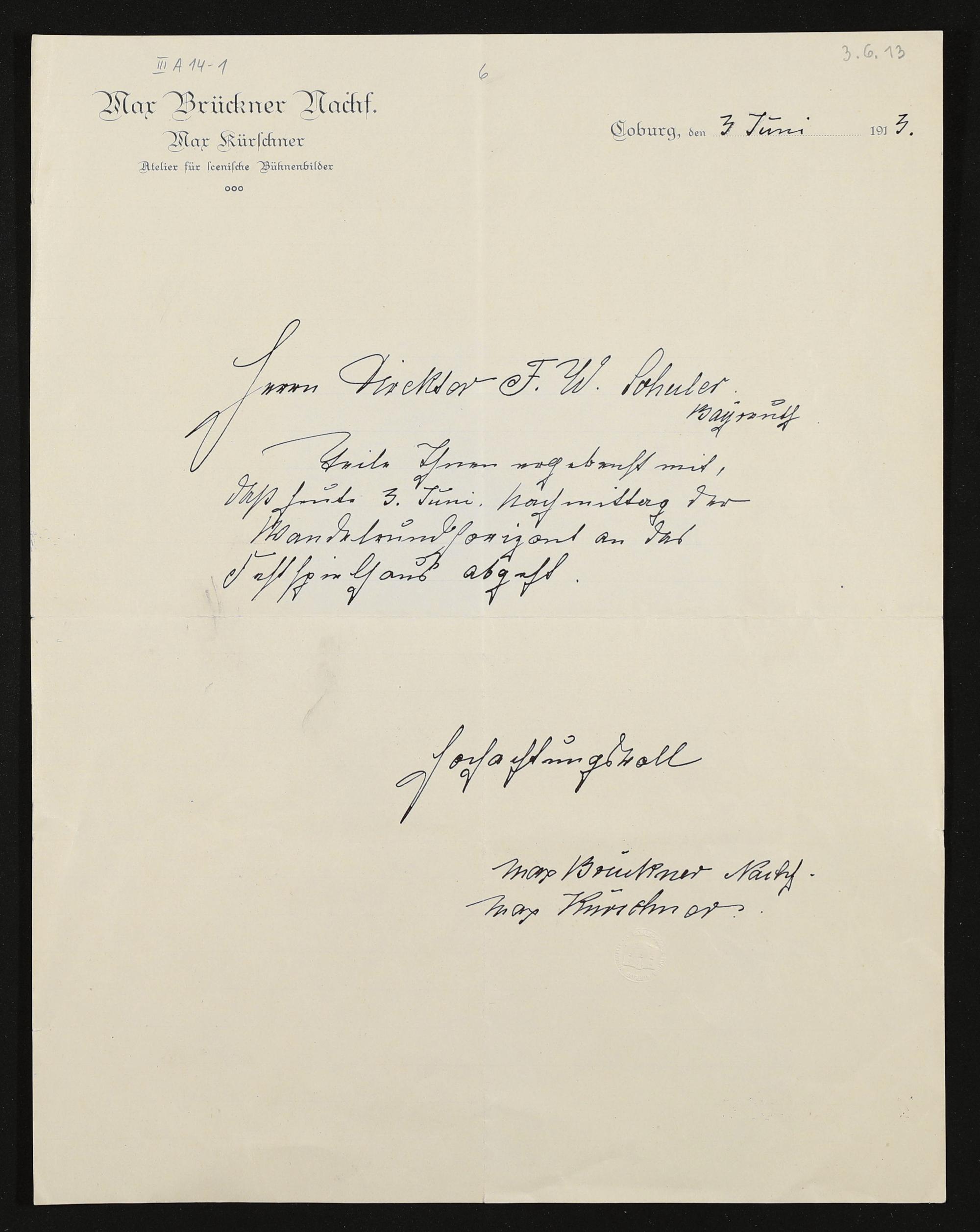 eigenhändiger Brief von Max Kürschner (Max Brückner Nachfolger Max Kürscher Atelier für scenische Bühnenbilder) an F. W. Schuler