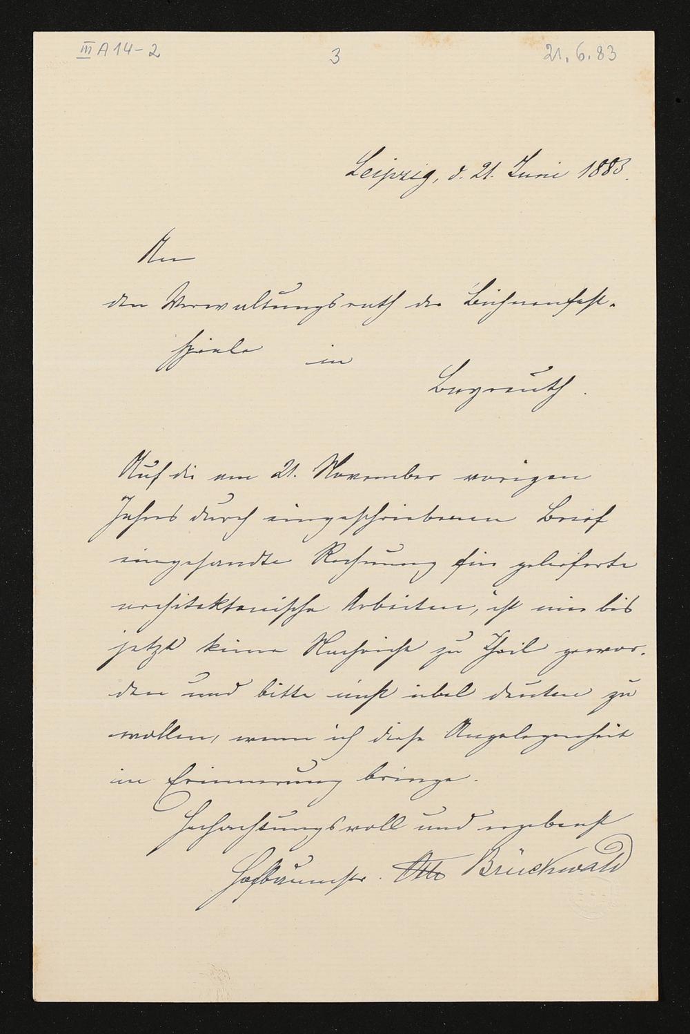 eigenhändiger Brief von Otto Brückwald an die Verwaltung der Bühnen-festspiele