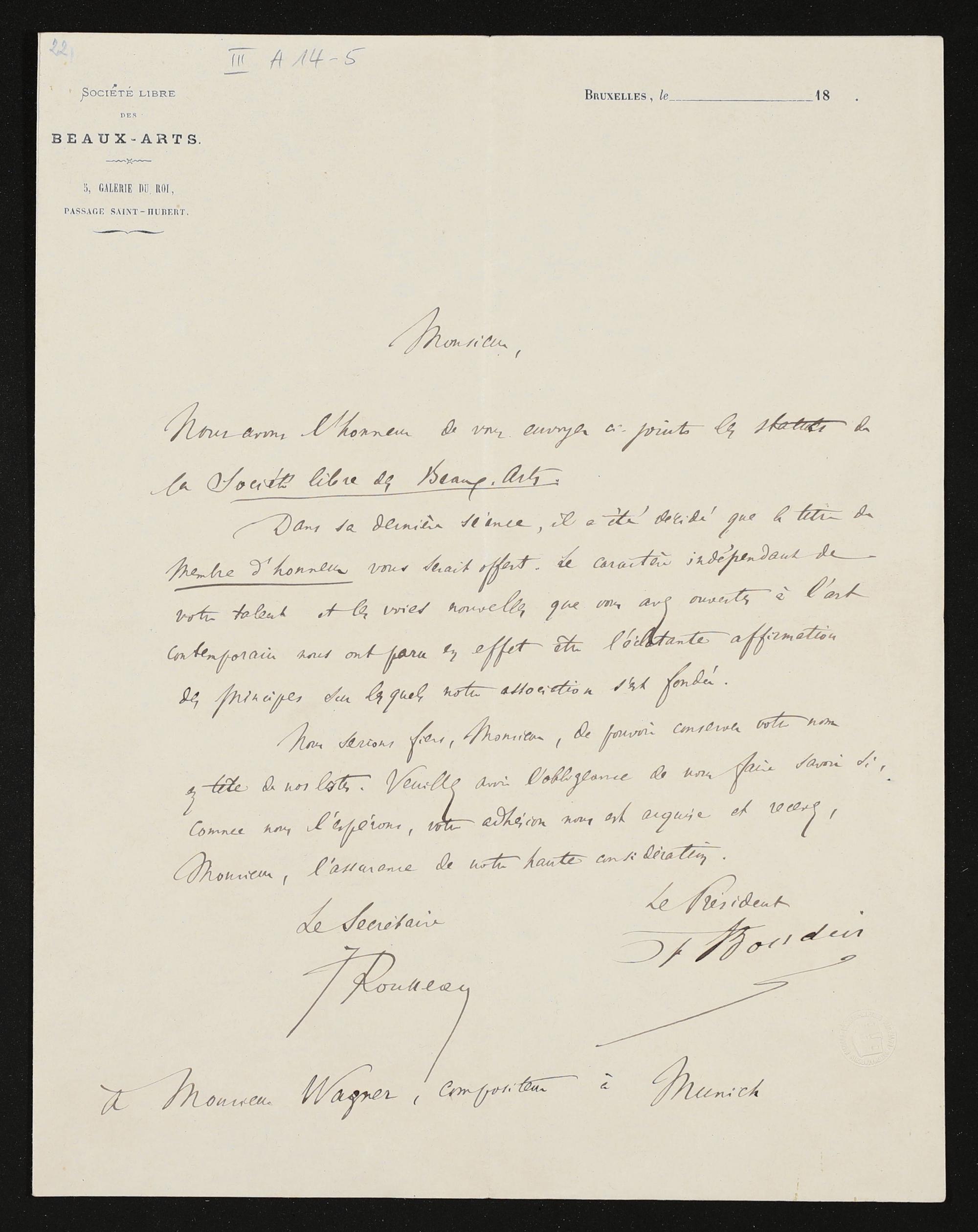 eigenhändiger Brief von der Société Libre des Beaux-Art, Bruxelles an Richard Wagner