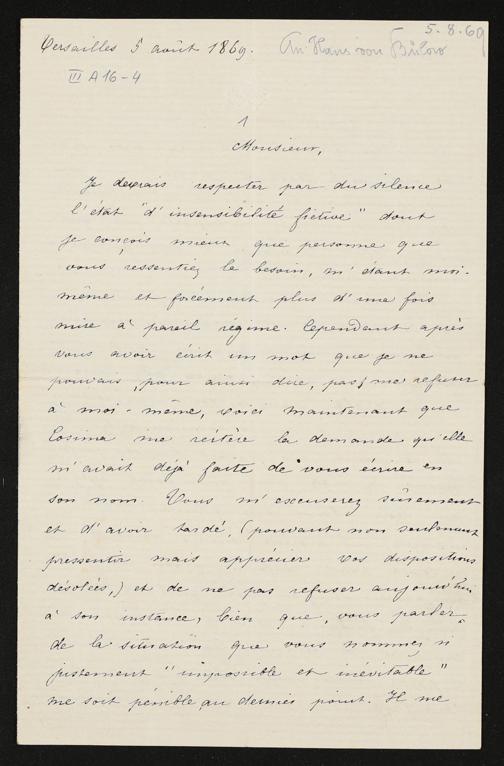 eigenhändiger Brief von Claire Marquise de Charnacé an Hans von Bülow