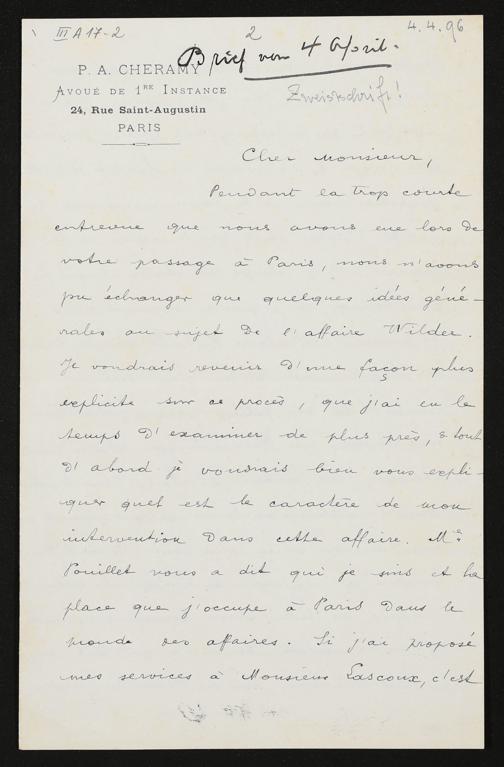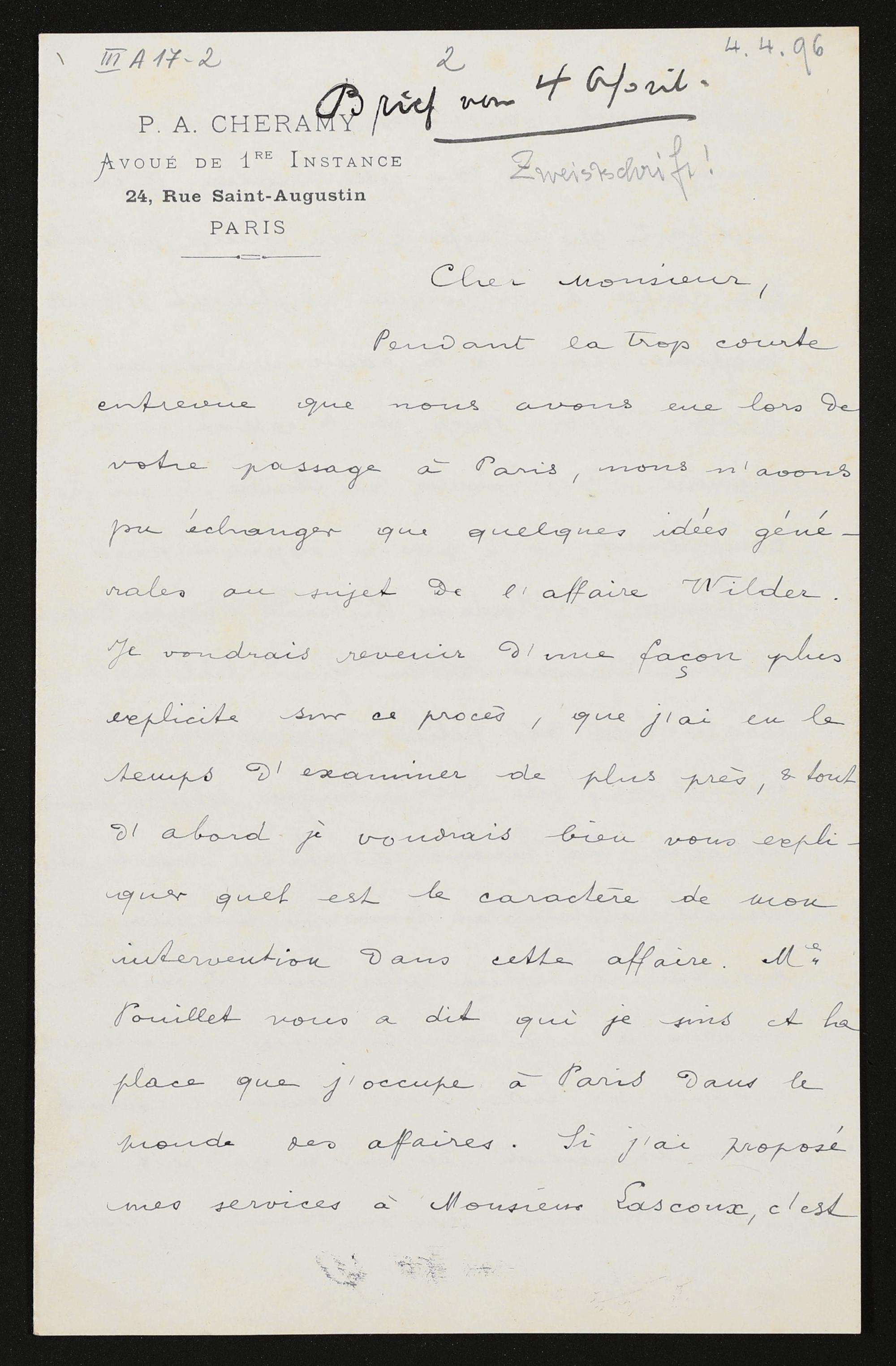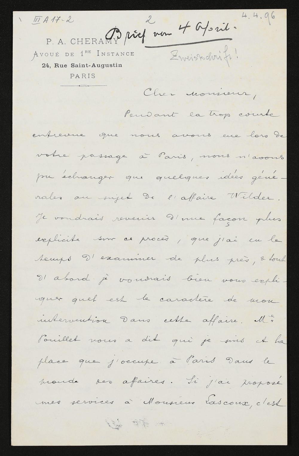 eigenhändiger Brief von P. A. Cheramy an Adolf von Gross