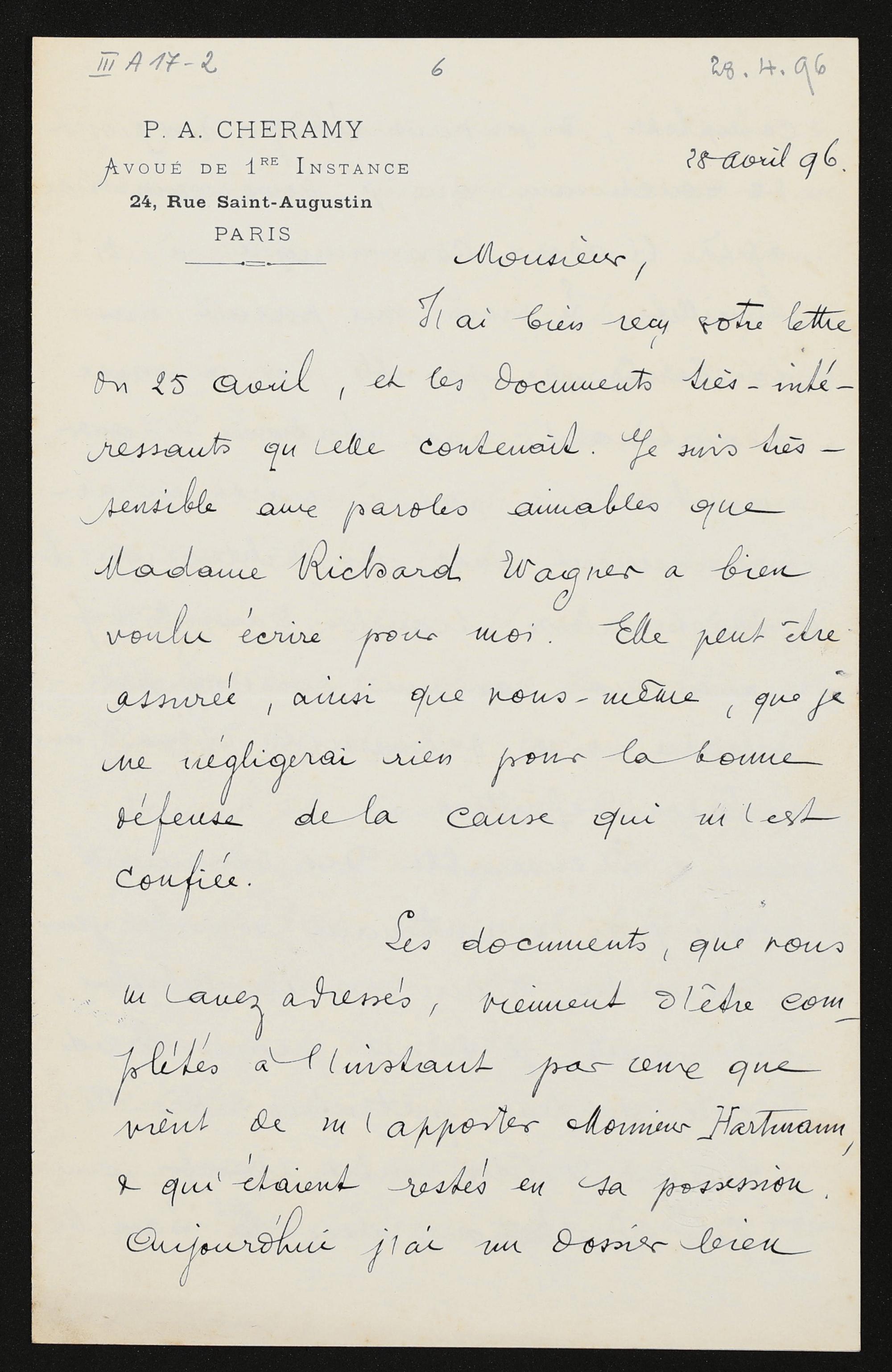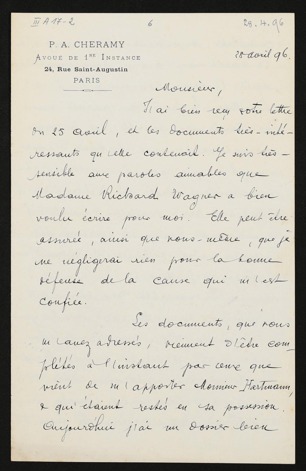 eigenhändiger Brief von P. A. Cheramy an Adolf von Gross
