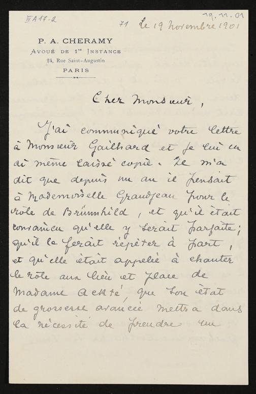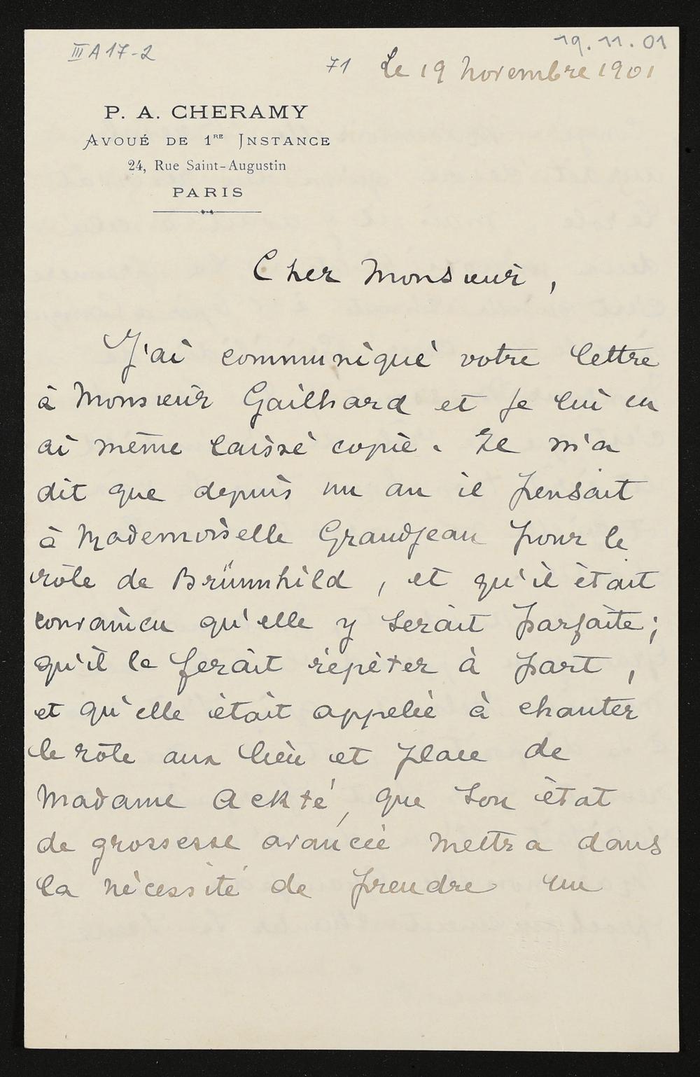 eigenhändiger Brief von P. A. Cheramy an Adolf von Gross