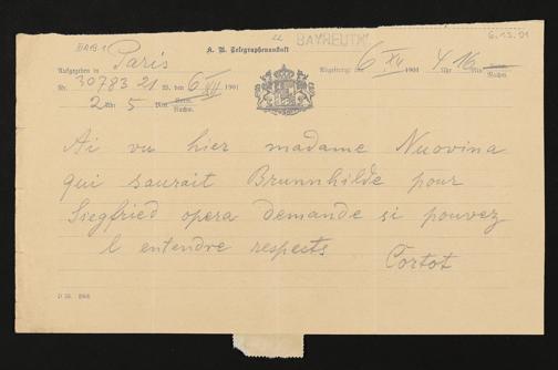 Telegramm von Alfred Cortot an Adolf von Gross