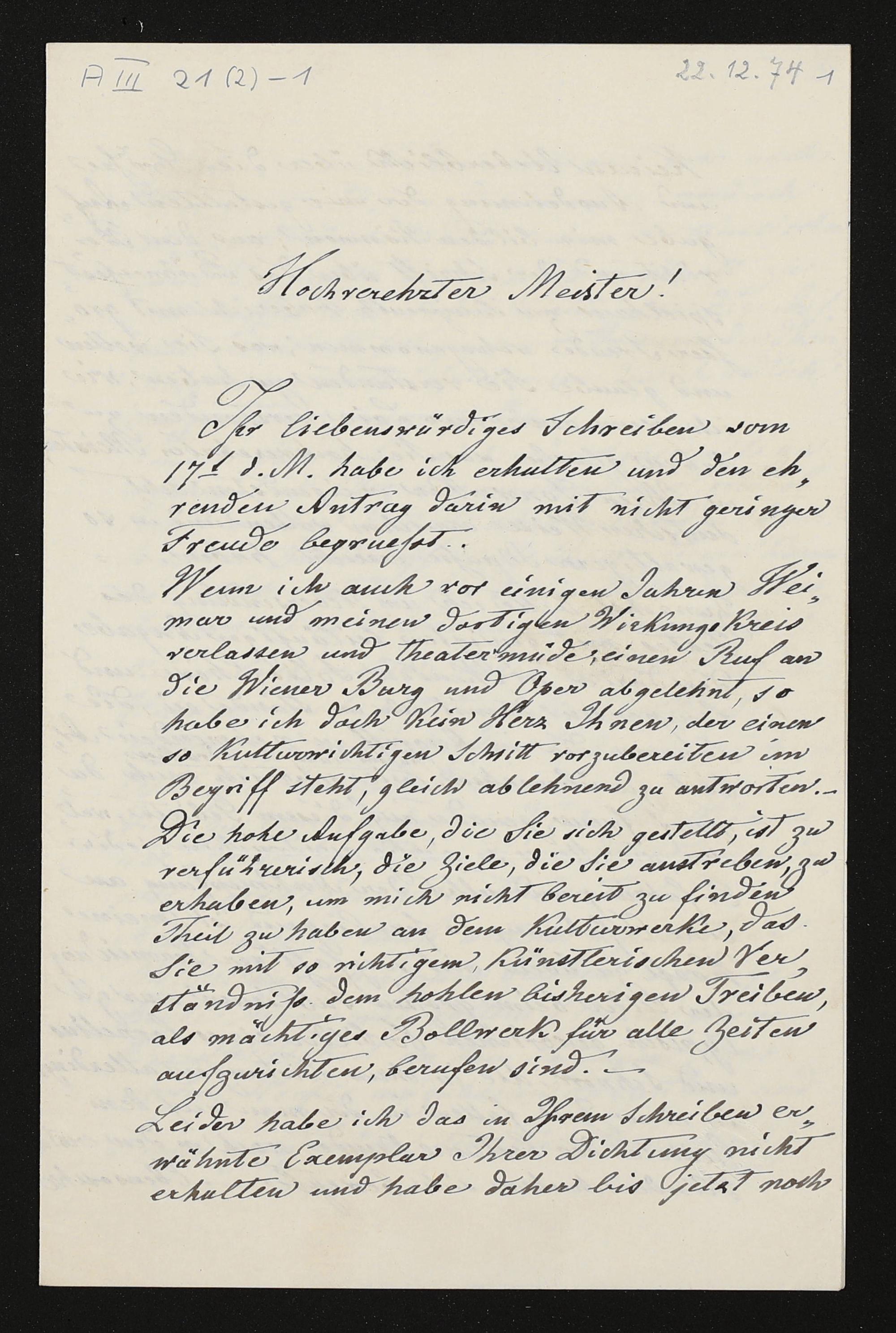 eigenhändiger Brief von Carl E. Doepler an Richard Wagner
