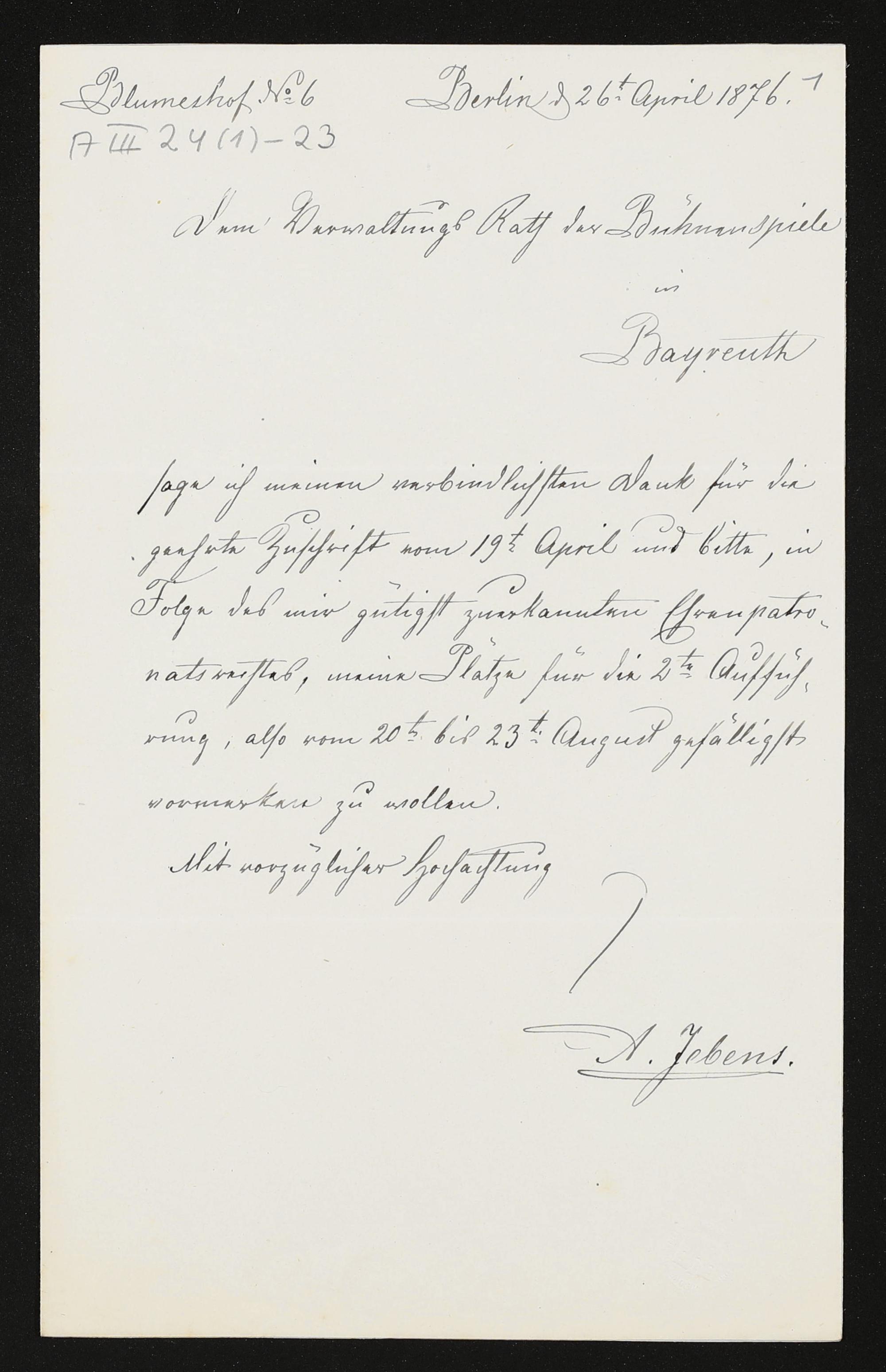eigenhändiger Brief von A. Jebens an den Verwaltungsrat der Bühnen-festspiele zu Bayreuth