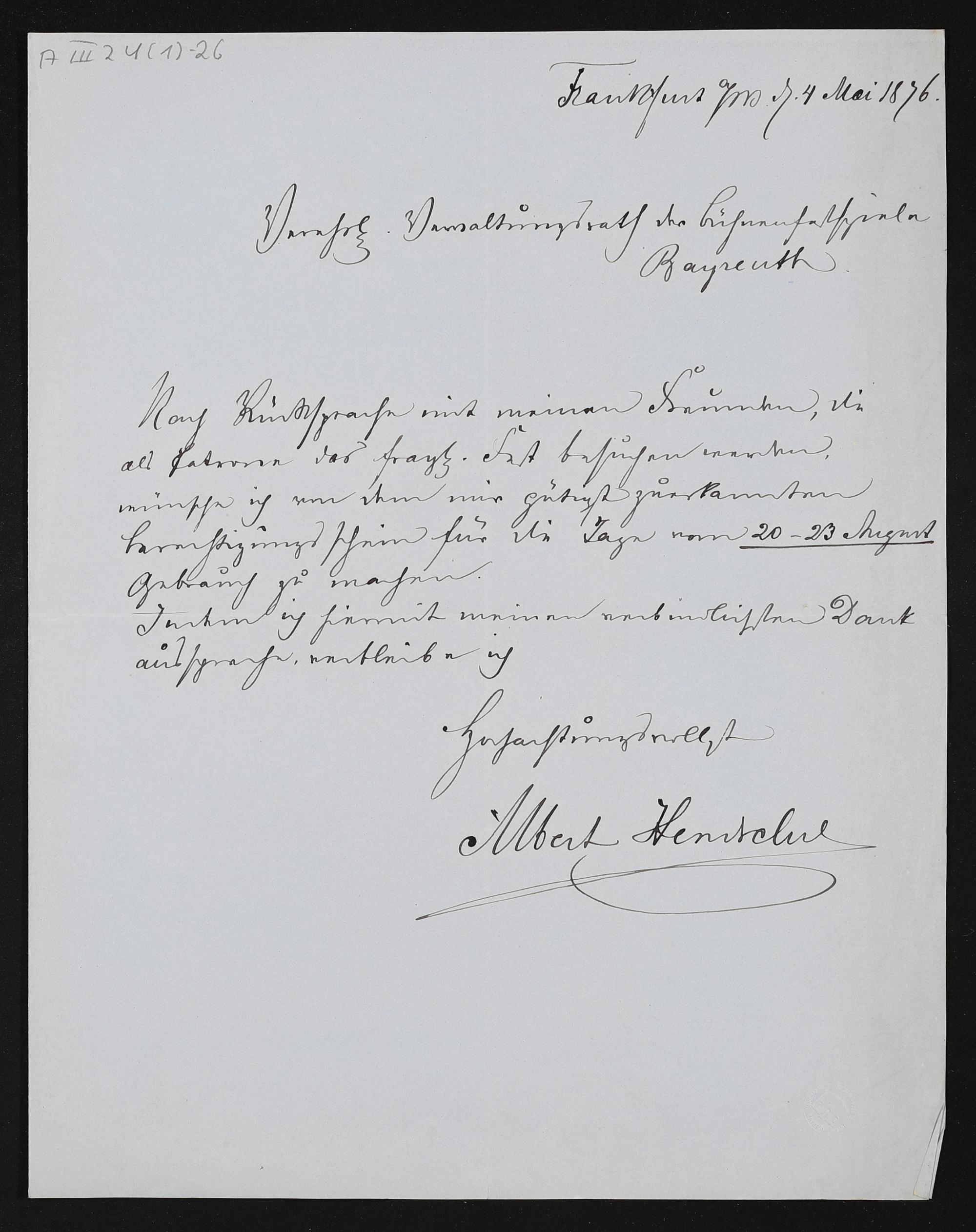 eigenhändiger Brief von Albert Henschel an den Verwaltungsrat der Bühnenfestspiele zu Bayreuth
